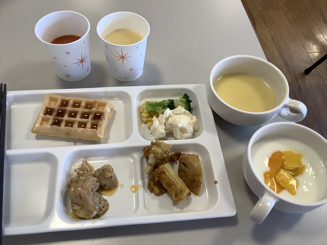 コンフォートホテルの無料朝食は評判いいです。スムージが三種類あったり、ご当地物の料理があったりといったところが評判の理由でしょうか。八戸では、ご当地物として"せんべい汁"がありました。この日は洋食をメインにしたので"せんべい汁"はいただかず、コーンスープをいただきました。他ワッフルに、たっぷりにヨーグルトなど。無料と思えば十分、11800円の料金に含まれていると思えば、CP的にはいかがでしょうか。