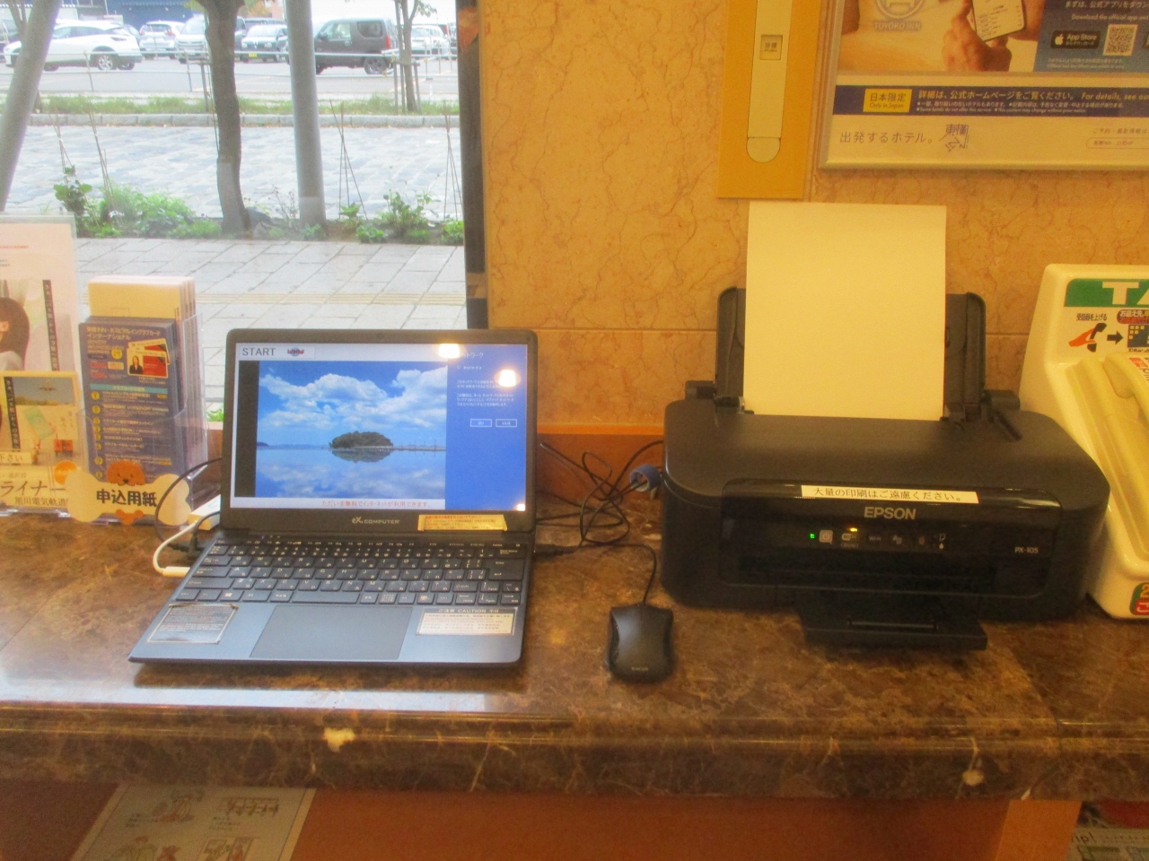 東横イン旭川駅東口の1階にPCが置いてありました。フロント付近ではあるが分かりづらいノートPCで、スタッフに教えていただいた。近年はWi-Fiのパスワードを貰って、各自持参したPCで勝手に利用しなさいというのがホテルの主流であるが、素晴らしいサービスであった。