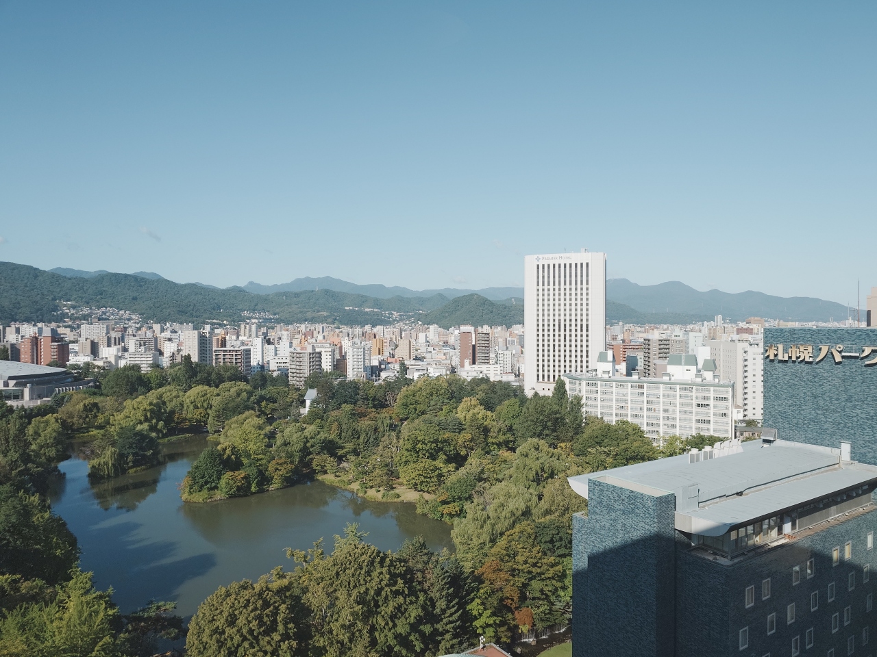 風光明媚な札幌市民憩いの中島公園のすぐ隣にあります。高層階からは中島公園の全景や藻岩山をはじめとする綺麗な山並みが望めます。とても静かで快適です。もともとはホテルアカシアと言って、公立学校共済組合北海道支部組合員向けに造られたホテルなので、今でも組合員向けの補助があり、人間ドック利用の際に宿泊する人も多いようです。