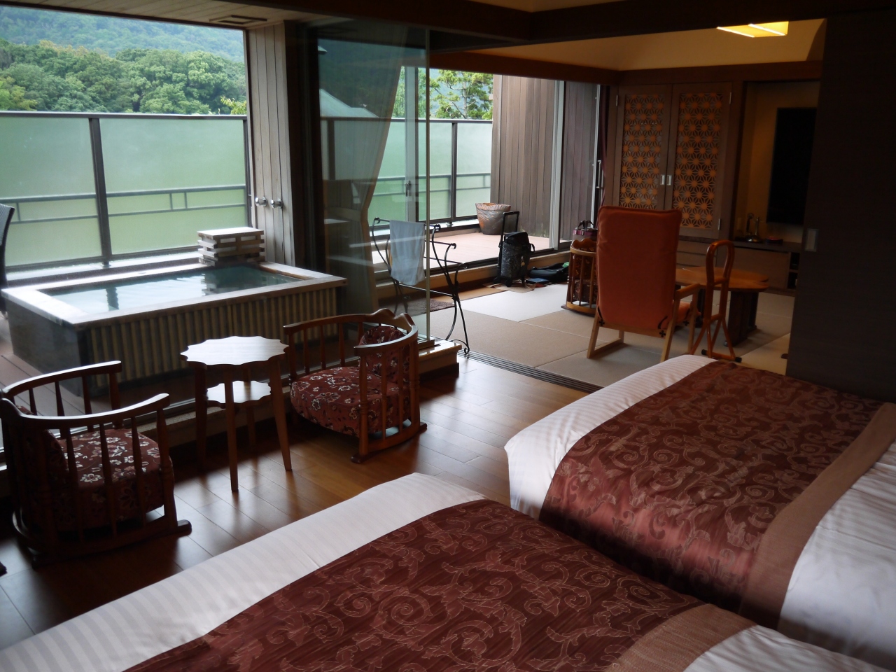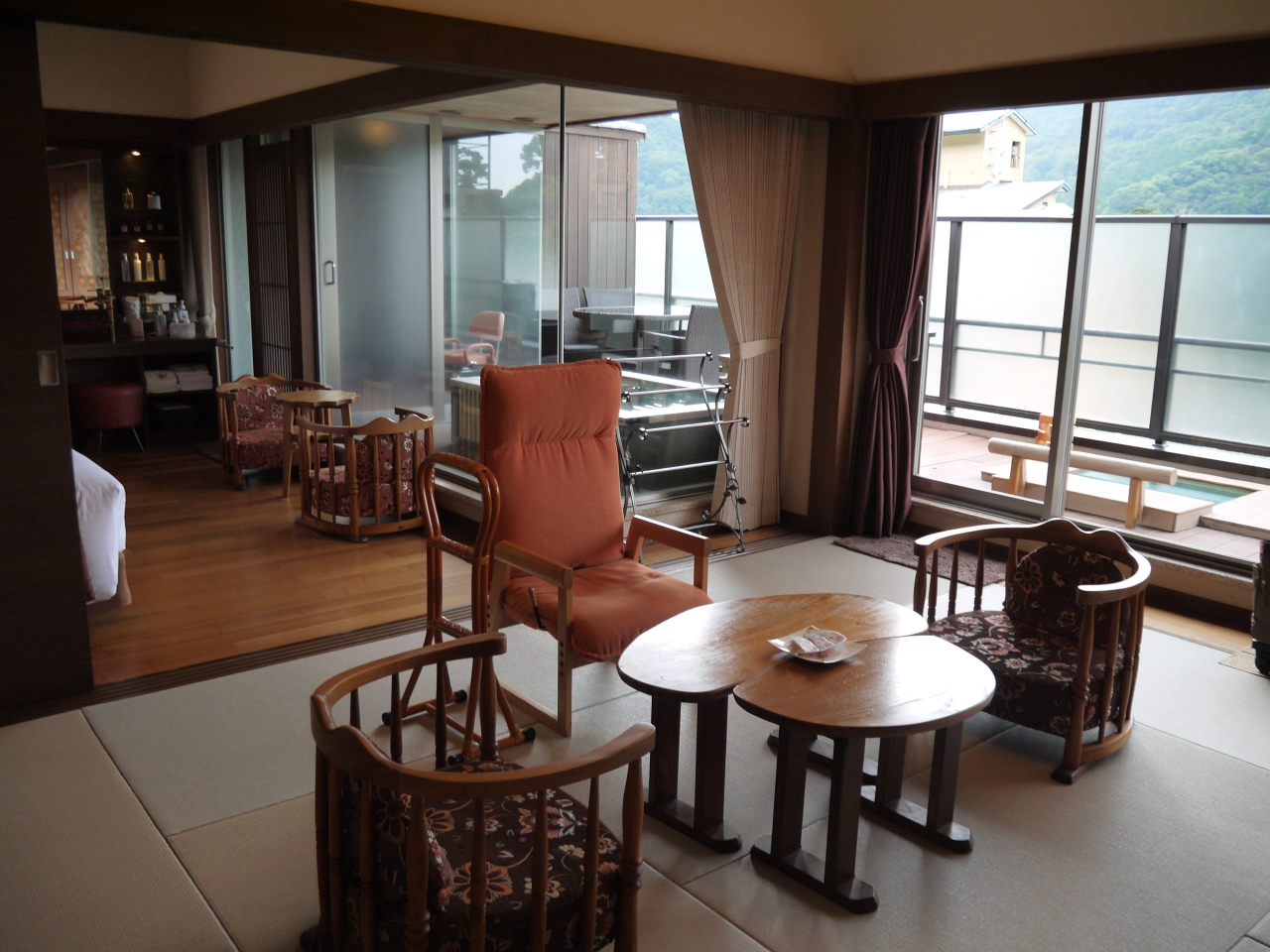 母親の米寿の祝いで宿泊しました。泊まったのは最上階六花フロアのテラスに露天風呂と足湯の備わる客室です。