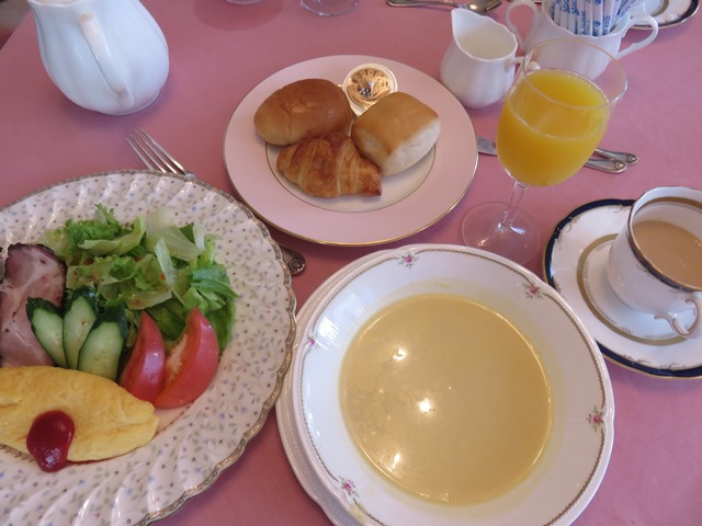 朝食 パン オムレツメインな洋食プレート おかわり自由な珈琲 オレンジジュース スープ 8:30~