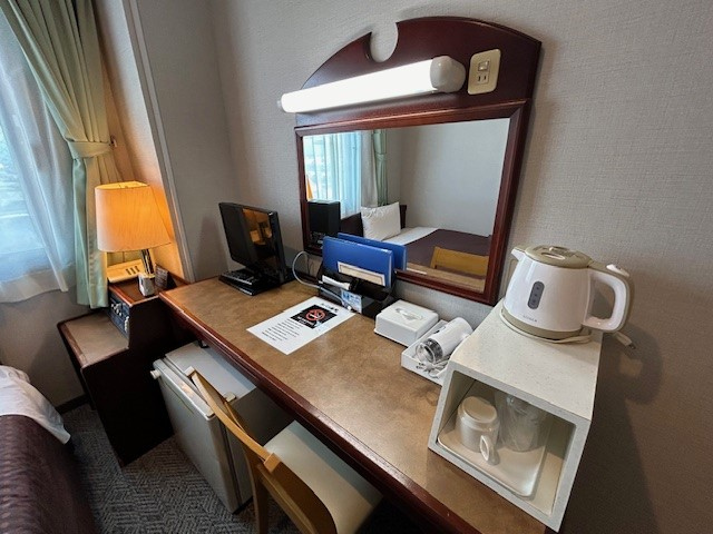 部屋はとても狭いです。デスクの椅子を引いたらすぐベッドにぶつかるくらいなので、椅子は使わずにベッドの上に座ってテレビを見ていました。