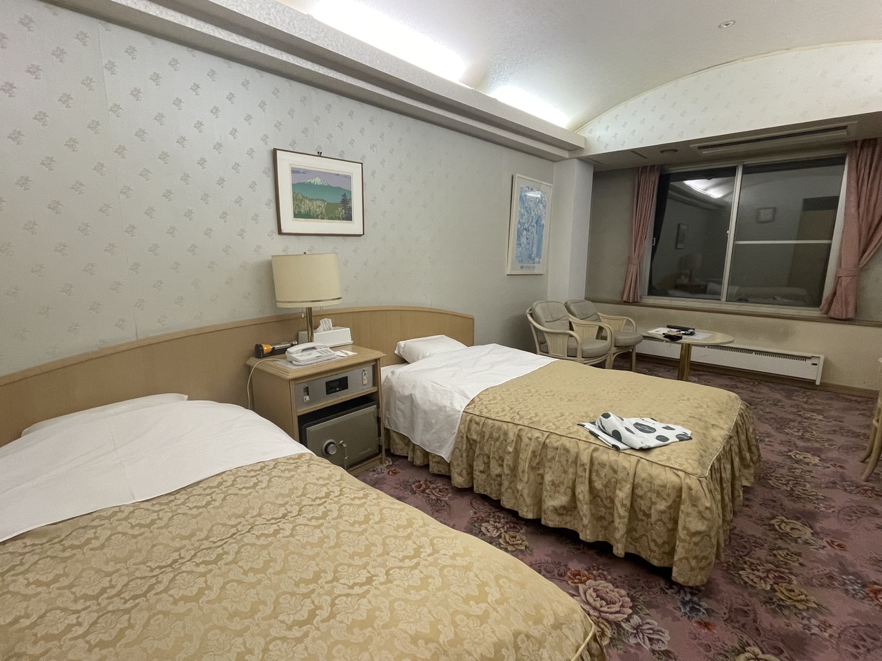 クリスタル館(休館)での宿泊だったこともあり、廊下や客室が全体的に古さを感じる部分は多く、暖房も暑いと感じるレベルできいており、空調が苦手な人にとっては少し過ごしにくいかもしれません。また、海外の団体客が多く夕朝食のバイキング会場では外国語が飛び交っています。