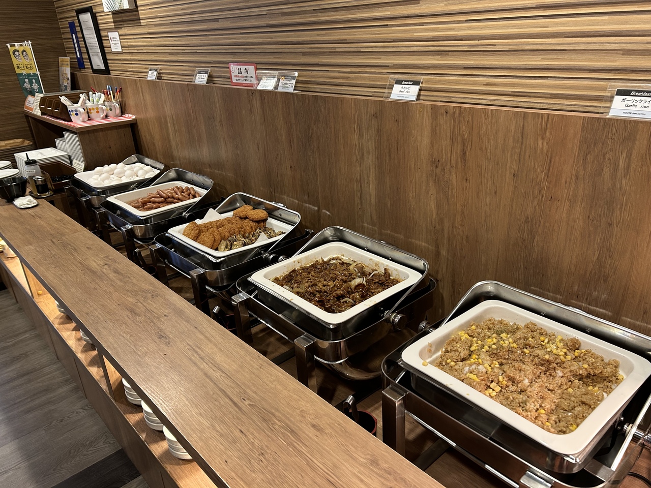 朝食はスーパーホテルなどの無料系と比べて品数が多い、毎日の惣菜入替が多く飽きないのが良い。