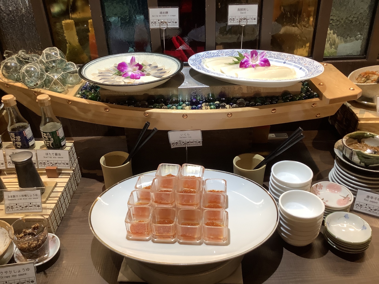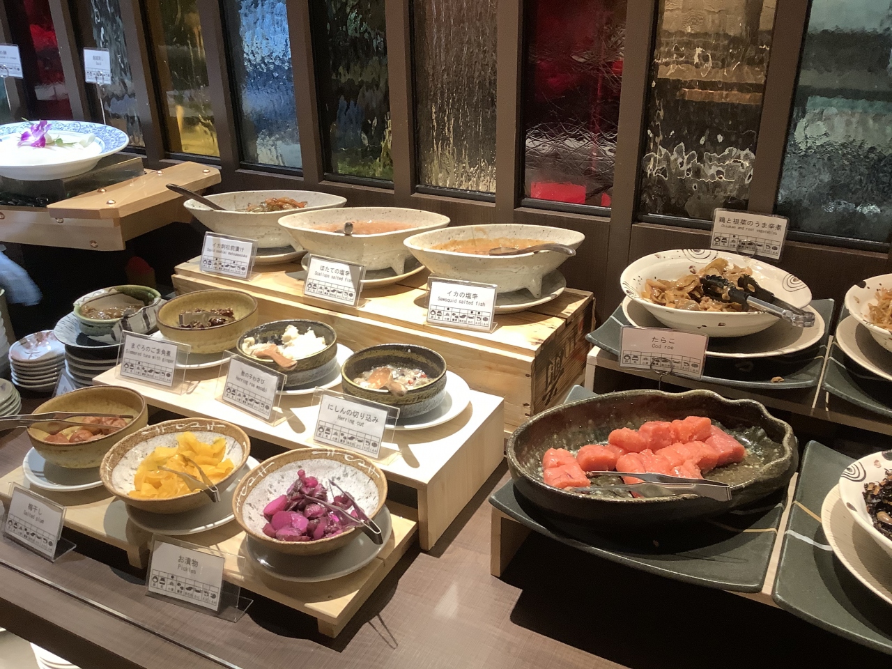 朝食バイキングは、イカの塩辛を先頭に、松前漬け、ホタテノ塩辛、にしんの切込みとご飯のお供多し。これだけ多いと迷う。イクラやイカの刺身、締め鰊などのお刺身や、あんかけけやきそばなどご当地物もあり。立派なバイキングでした。