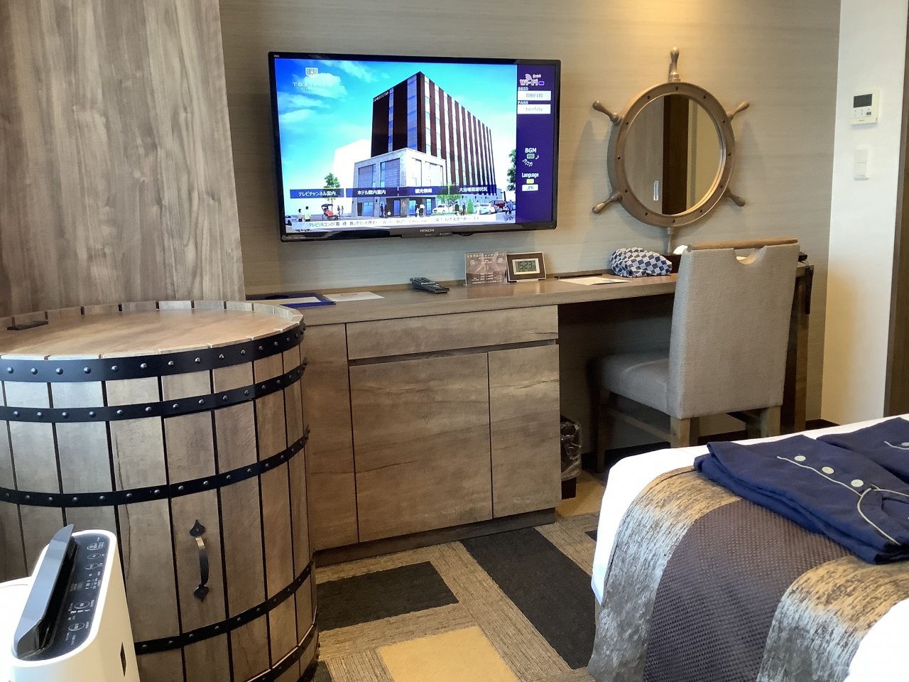 部屋のインテリアは、小樽だけに"運河"でもテーマにしているのか、鏡が舵だったり、部屋に樽があったり。因みに、樽の中には冷蔵庫が入っています。