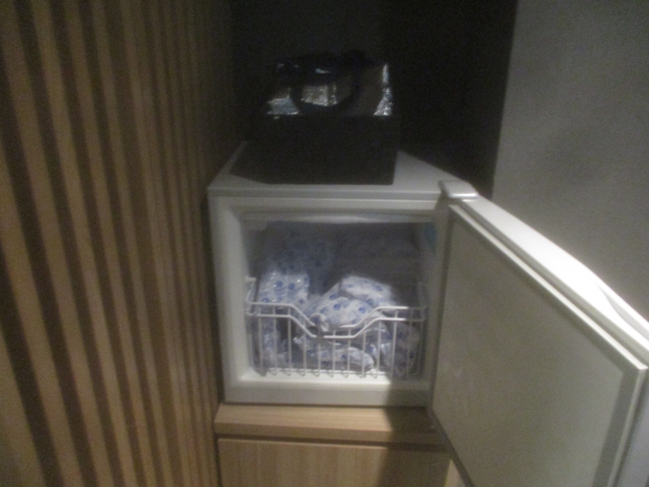 global cabin横浜中華街の共通エリアに小型の冷凍庫が設置されていました。開けてみると中に保冷剤が入っていました。キャビンやカプセルタイプのホテルなので冷蔵庫はありませんが、部屋へ持ち込んで簡素な冷蔵庫代わりにすることができました。