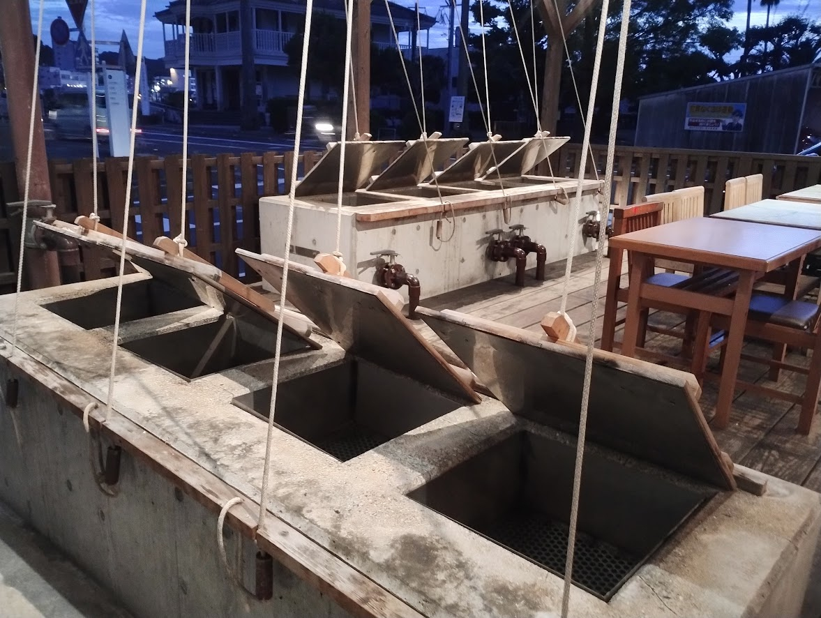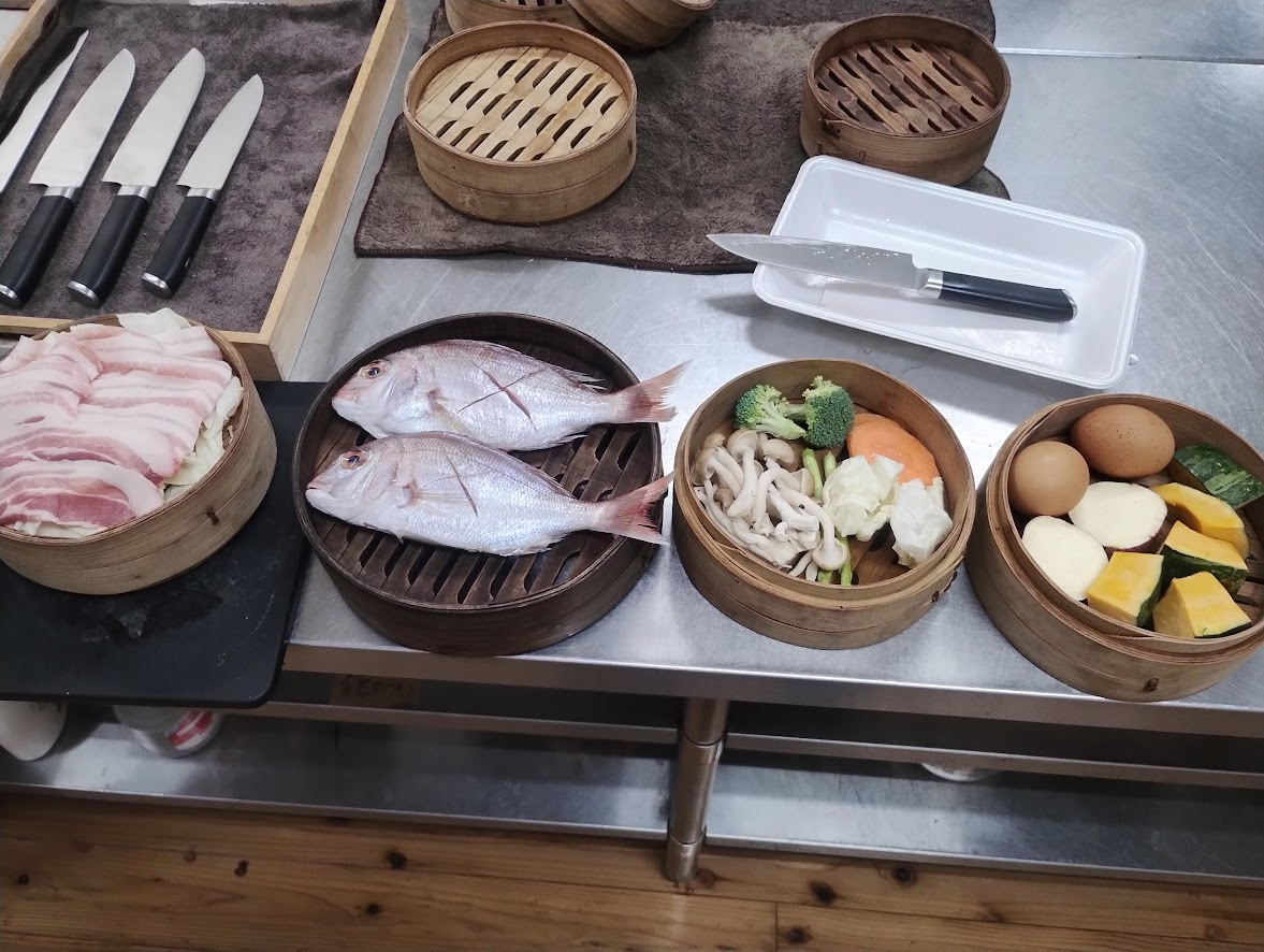 温泉量豊富な小浜温泉では、温泉の蒸気を使って蒸し窯料理が有名ですが、蒸気屋は蒸し窯を使ってセルフスタイルで食事が楽しめる宿です。宿泊プランは素泊まりで、朝夕食は蒸し窯で好みの食材を蒸して作ります。徒歩範囲にスーパーが2軒あるので、野菜、肉、魚を買っていろいろな料理が作れます。調味料、食器、調理道具はそろっています。蒸し窯で米も炊けます。