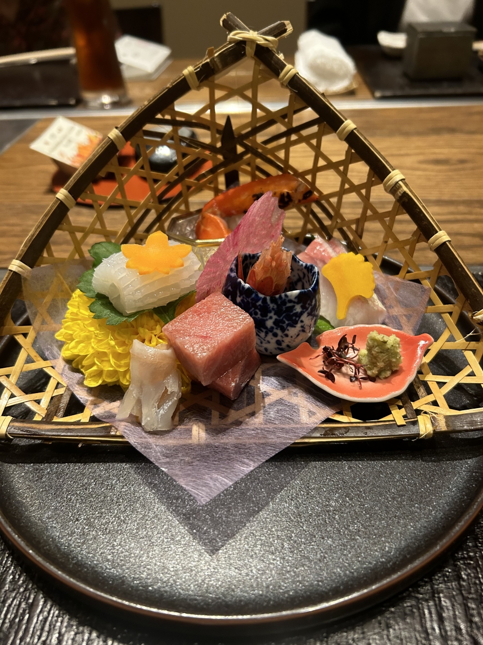 料理は、リピート率No1の『黄金食材会席プラン』が最大8,000円OFF というのを申し込んだ。料金は、朝夕食付・税込み税サ入湯料込みで 一人35,250円。なかなか結構なお値段だと思ったが、料理が素材、味、量いずれをとってもとても素晴らしものだった。