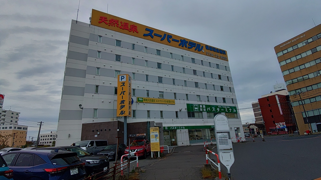 釧路駅の直ぐ脇にあり改札から歩いて2分程、交差点を渡る必要も無いのでめちゃ近いです。