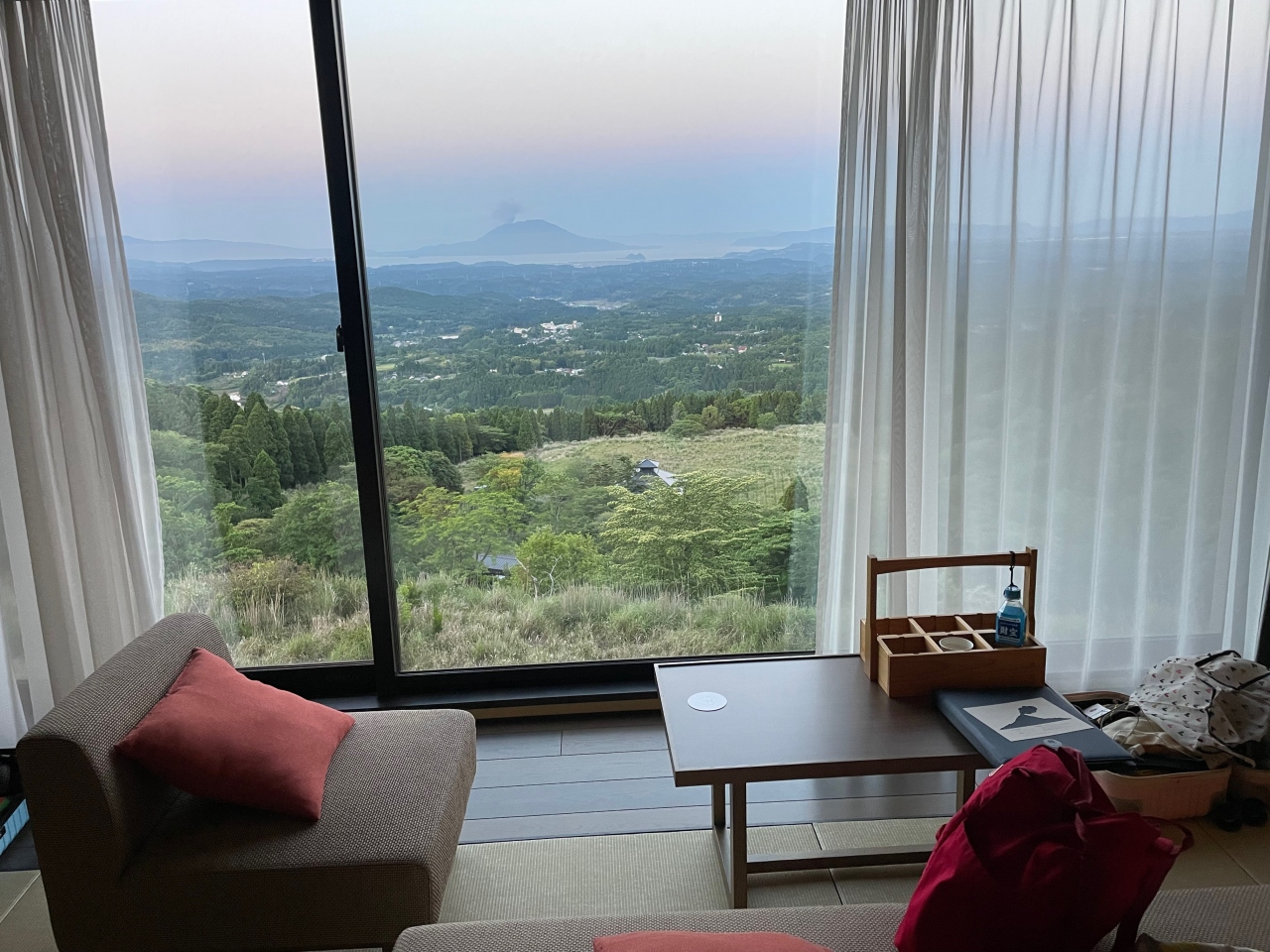 界 霧島は全室桜島ビュー、壁一面が全て窓になっていて、真正面に桜島を臨む素晴らしい眺望を楽しめます。