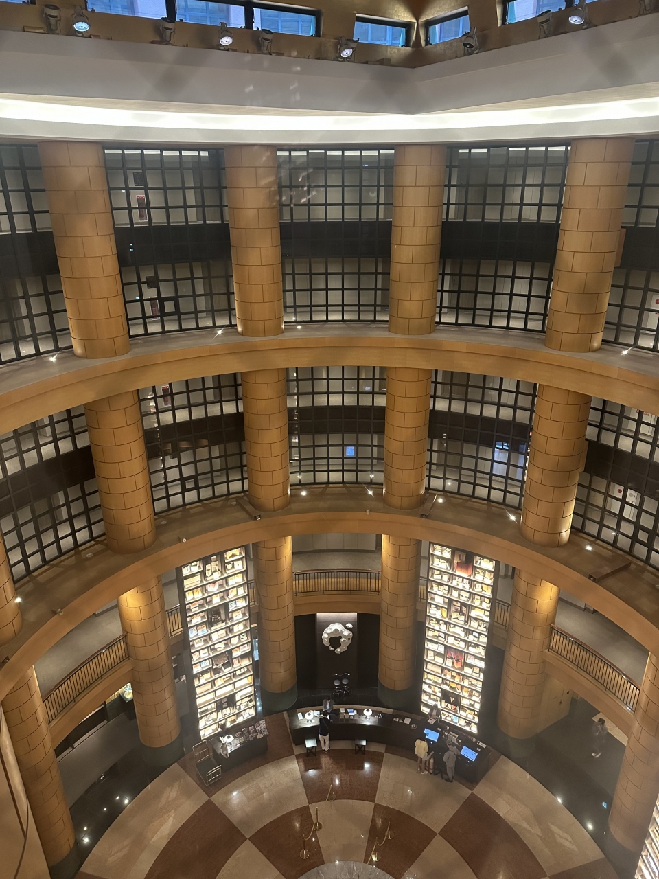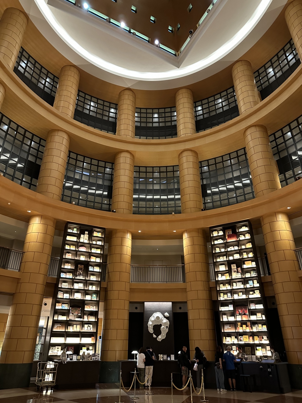 入り口を抜けると、外観からは想像できない、写真で見るよりすごい本棚に囲まれたユニークなロビーに圧巻される。
