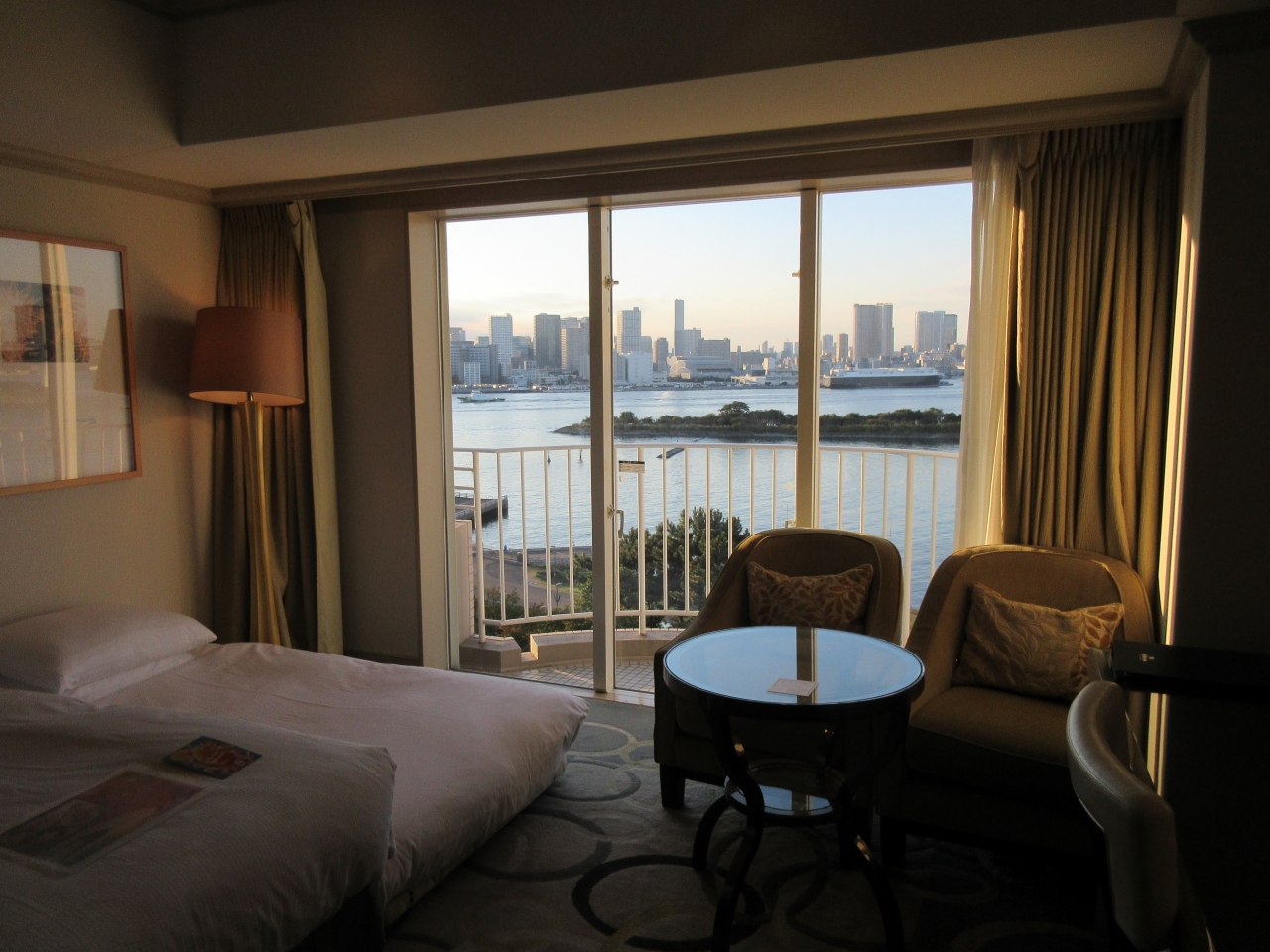 客室のドアを開けると、窓越しに明るいレインボーブリッジと東京湾の絶景が迫ってきます。客室には狭いながらもベランダがあって、外にも出られます。日中→夕景→夜景と移り行く景色を楽しみました。夜は屋形船もたくさん浮かんでました。ソファーに腰かけても、ベッドに横になっても飽きずに楽しめました。翌朝の景色も良いです。潮の香りは望めませんが、窓を開けてベランダに出られるのが良いと思います。