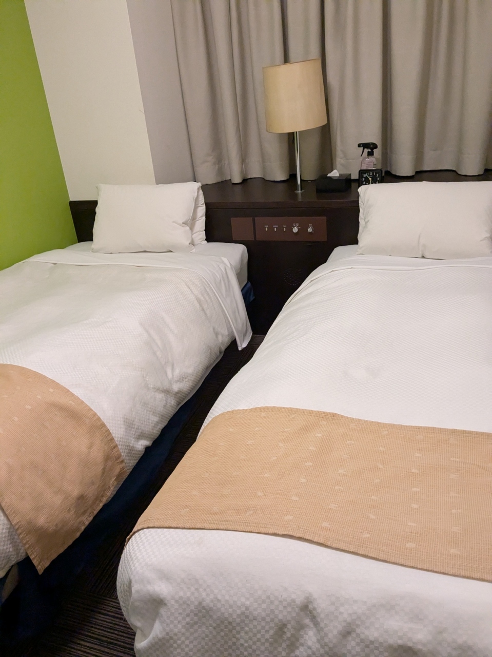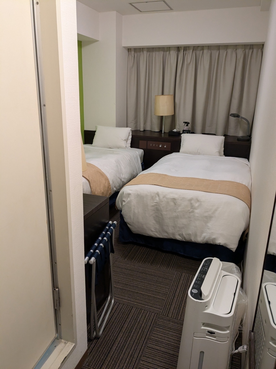 ムスメとスタンダードツインに宿泊。連泊フロア利用だと、洗濯機無料、選べる枕サービスなど特典あり。冷蔵庫と冷凍庫がありました。