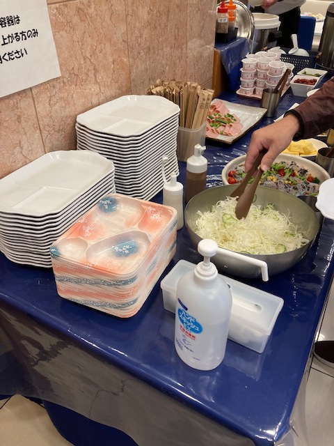 無料の朝食には、肉すいがあり生の野菜(キャベツ)がある。