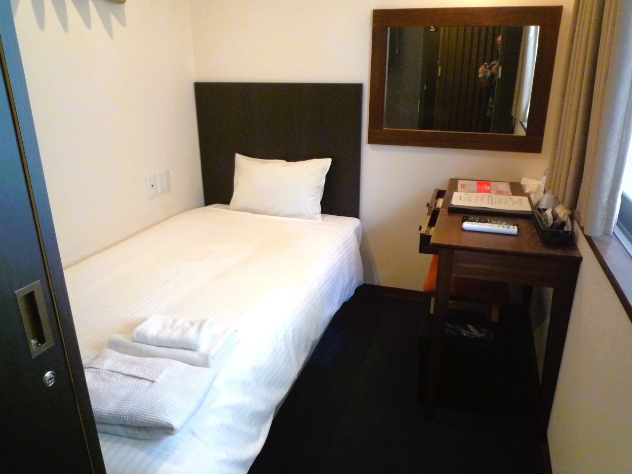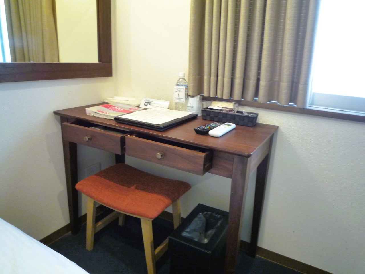 ベッド・デスク・エアコン・液晶TV・大型ロッカーにアメニティ・500mペットボトルがサービスとして付いてます。