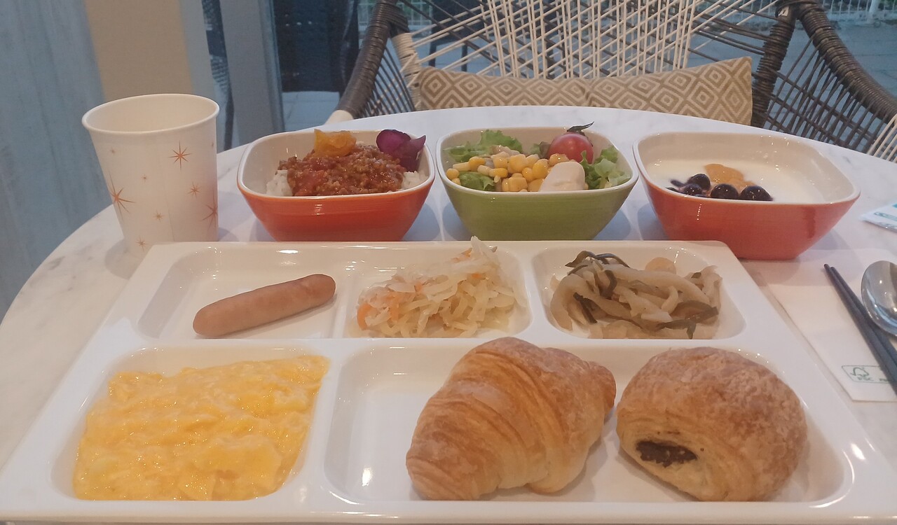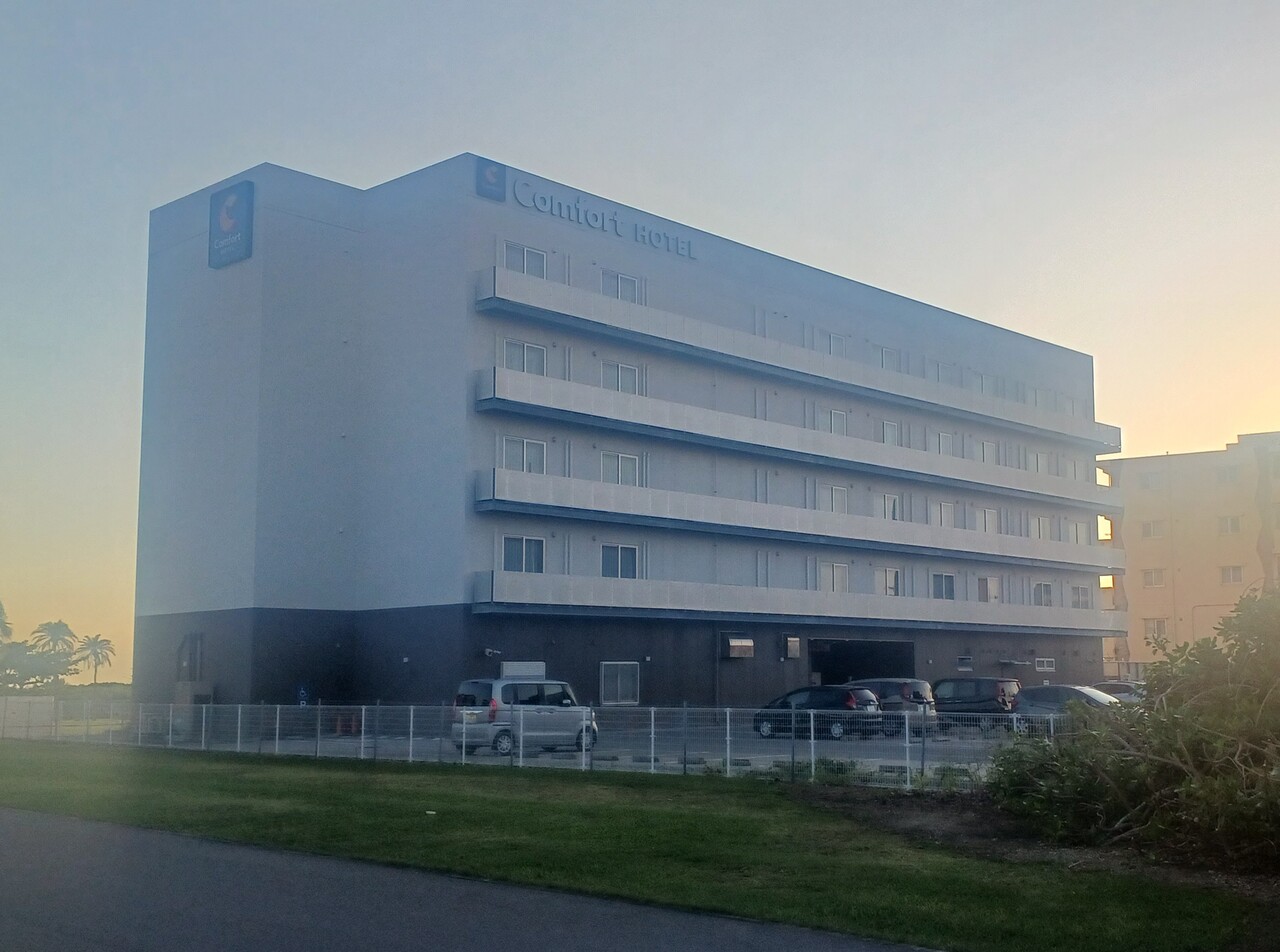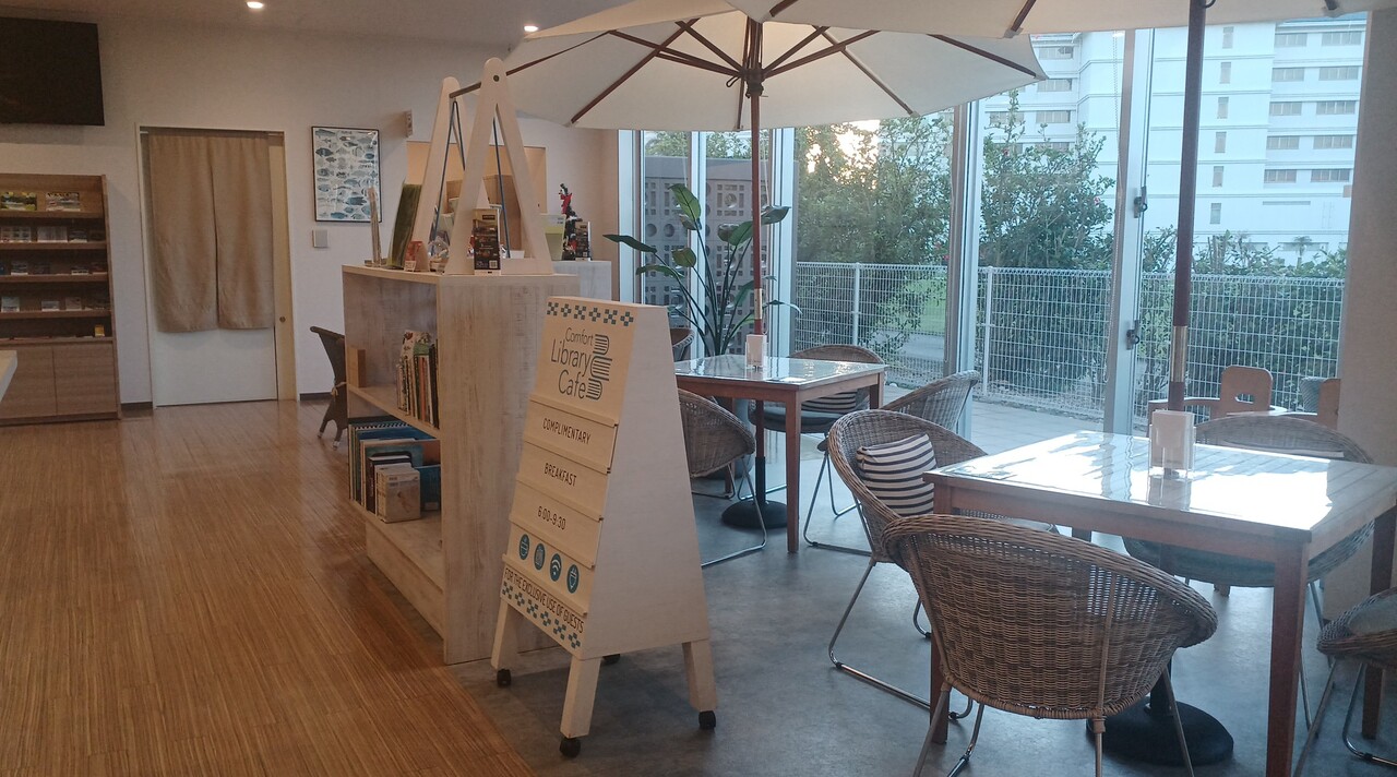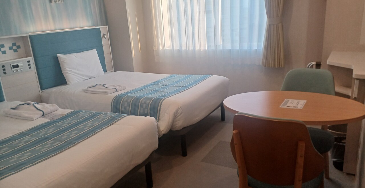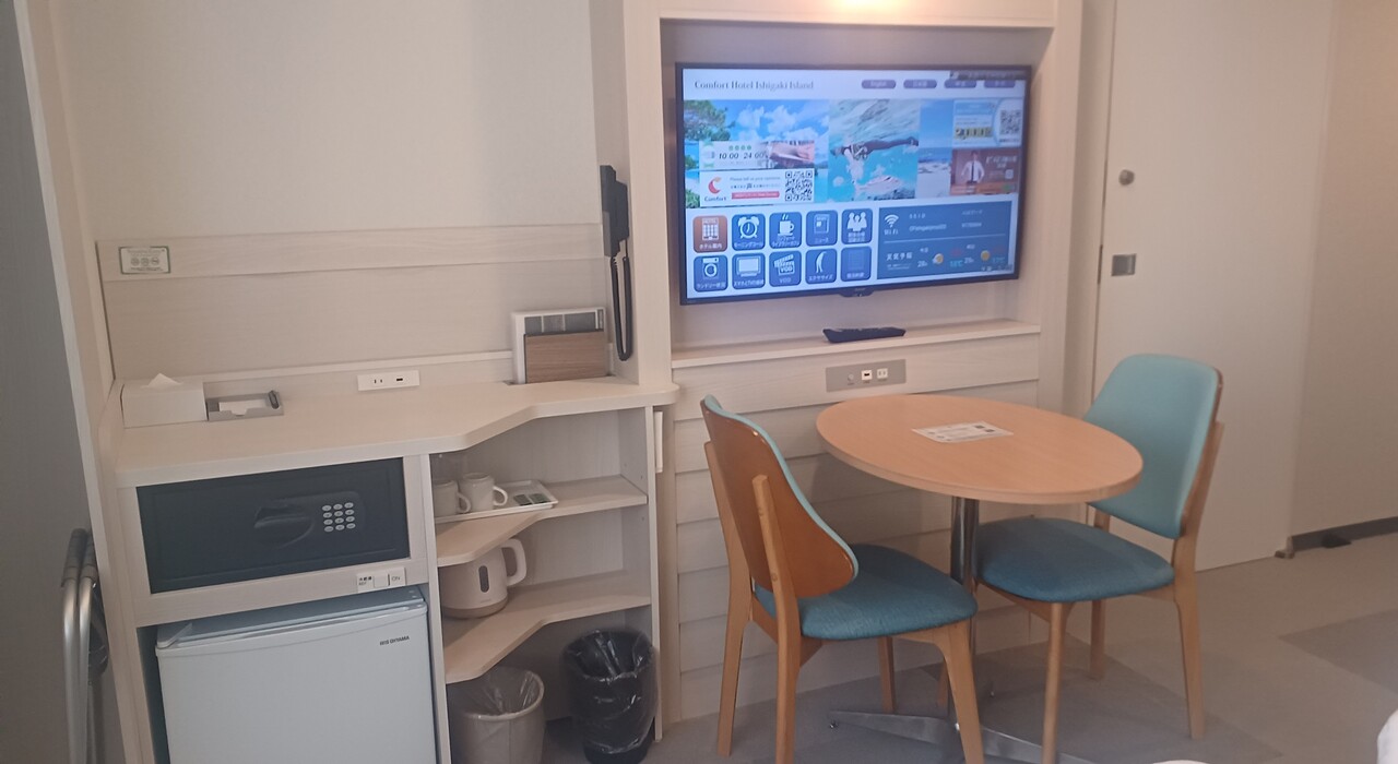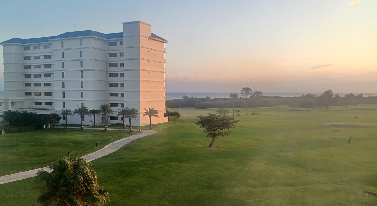 ウエルカムドリンクはさんぴん茶と水?のサーバーあり。エレベーターは1基。窓は15センチくらい横に開く。部屋は水色で爽やかなイメージ。窓からは広い芝生の向こうに海と右手に沈む夕陽が見えてキレイだった。駐車場は平置きで広く停めやすかった。サンエーまで徒歩10分くらい。朝食の品数が少なめだったのが少し残念。全体的に女性向けの雰囲気かな。