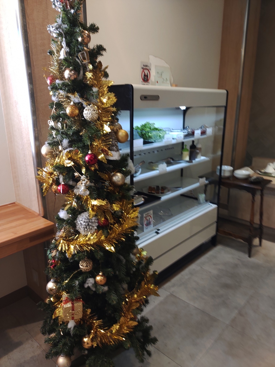 ランチバイキングビュッフェをいただきました。税込1800円で、広い宴会場でやっていました。季節がら、クリスマスツリーも飾られていて、ロマンチックでした。向かって左手の冷却された棚には、サラダやフルーツやミニケーキが並んでいました。あんかけ焼そば、牡蠣フライ、豚肉の生姜焼、カツ、味噌汁、スープ、コシヒカリのごはん、各種ドリンク等、盛りだくさんでした。