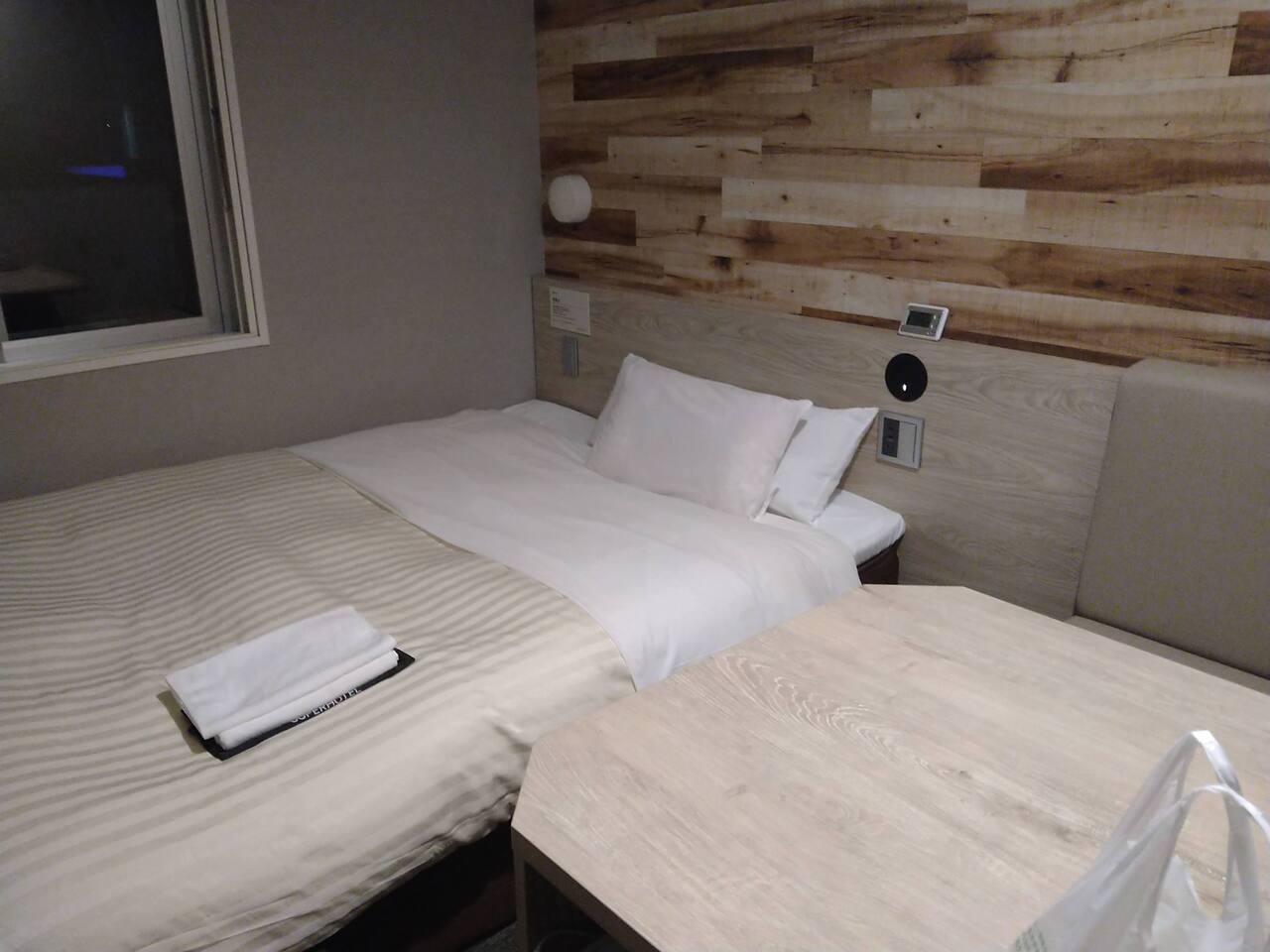 スーパーホテルはテーブルも広めで使いやすい。