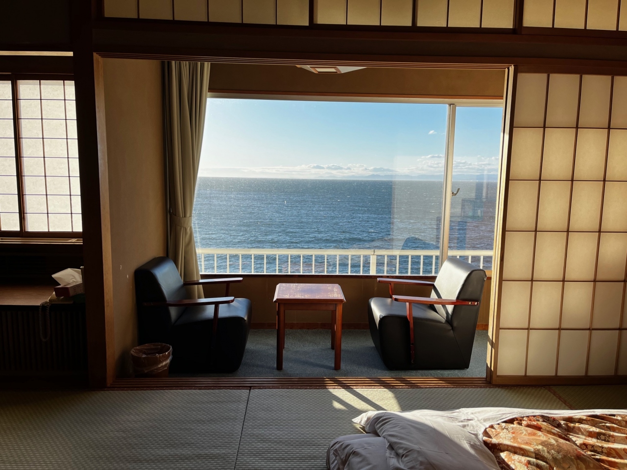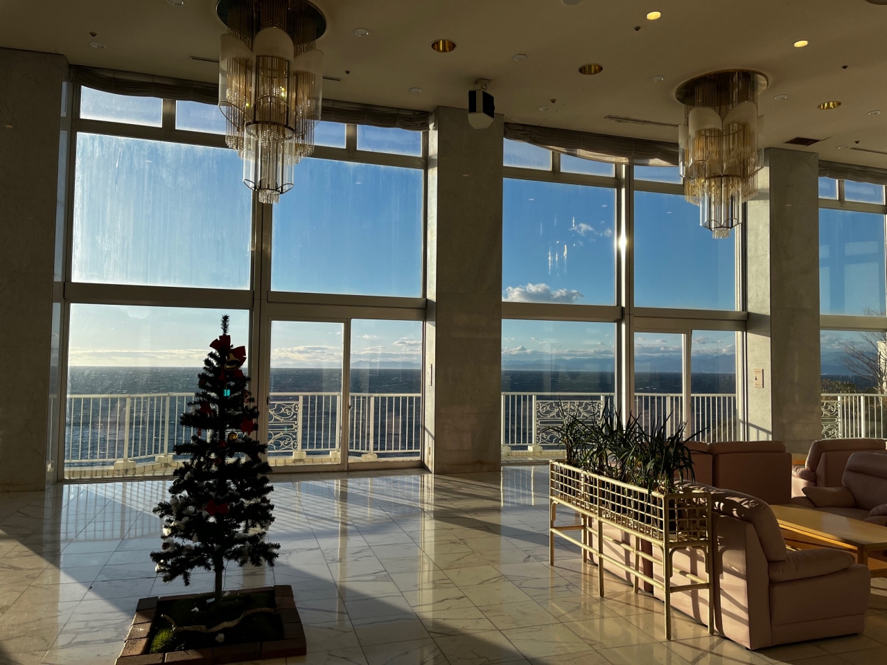 駿河湾に面した岬の上に建つ絶景のホテルです。フロントの後ろ側には駿河湾を見渡す、大きなガラス張りの広いラウンジがあり、ソファーが3~40くらい?ゆったり配置してあります。いい雰囲気です。