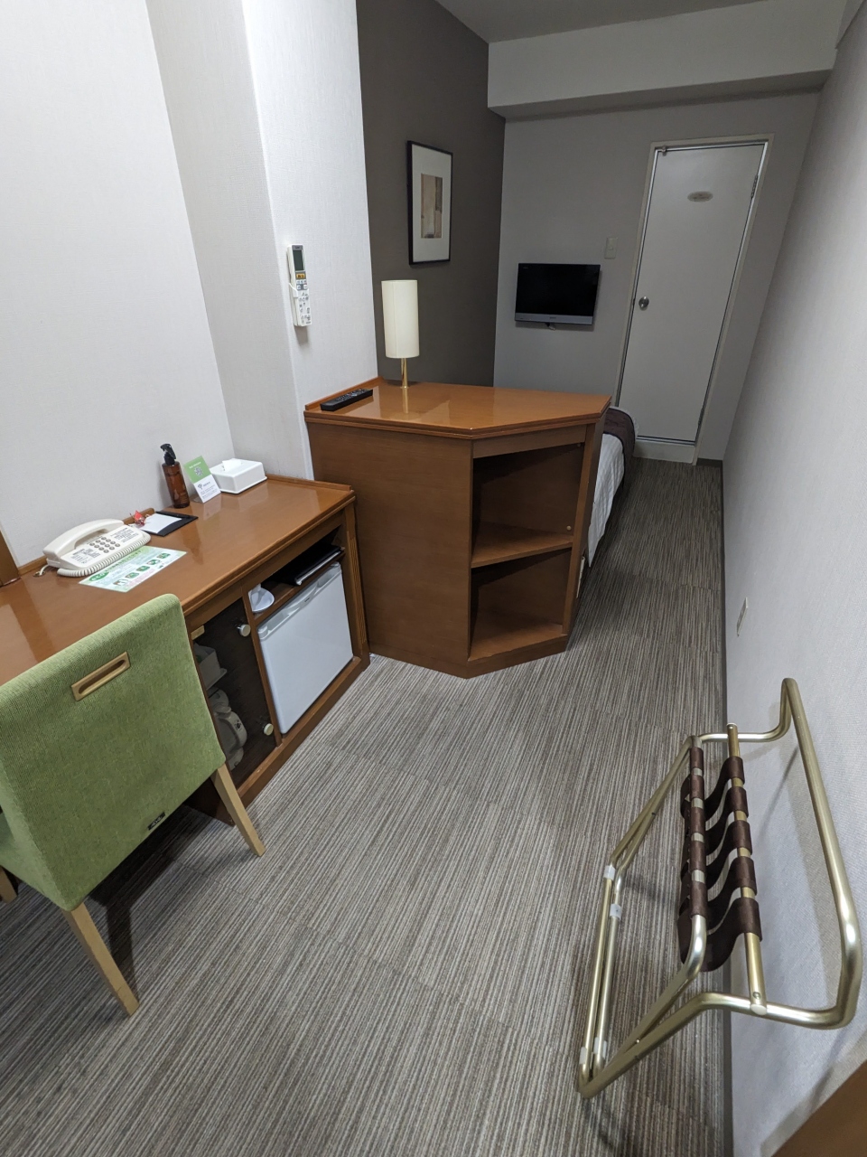 熊本でも老舗でちょっと年季が入っているためか、その分お値段控えめで泊まれました。ロビーは重厚感があるし、大浴場もあっていいです。お部屋は窓なしですが自分は特に不便は感じなかったです。(エアコンで調整すれば良い。)JRにも、繁華街にも等しく遠い立地が多少難点ではある。