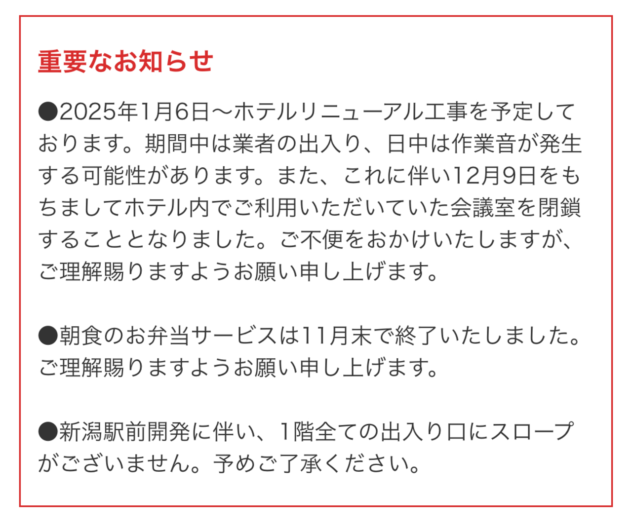 2025年1月6日からホテルリニューアル工事を予定してて、その間は業者の出入りや