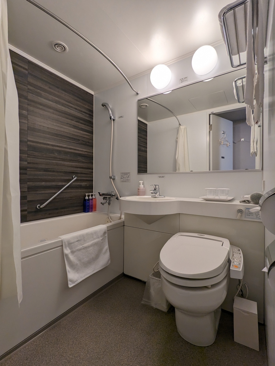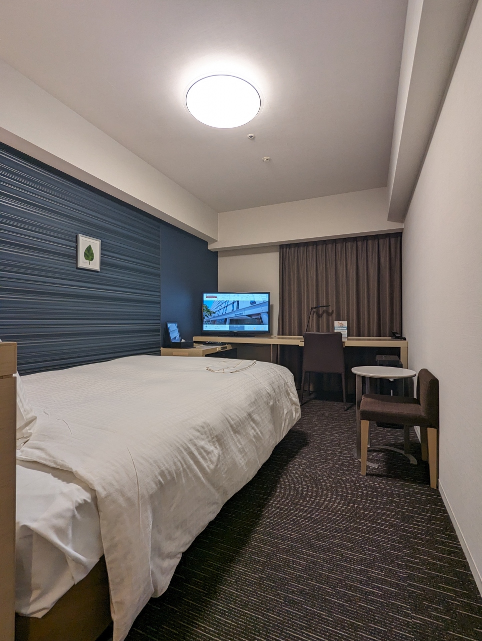 客室だけでなくロビー内も、清潔さを維持していることはさることながら、シンプルでありながら各調度品が品よくさっぱりとまとめられており、落ち着いた雰囲気で滞在できると思います。各客室の広さは標準的なビジネスホテルと同等ですが、調度品やアメニティもあまり多くを置かず効率的な配置にしているからか、窮屈という印象は全くありませんでした。特にバスルームは比較的広めに設計されており、しかも(古いホテルなどによく見られるような)落ちにくい汚れも全くと言っていい程見られず、快適に利用できると思います。前述の通りホテルの周囲に飲食店はやや少ないですが、その分夜間は静かに過ごせると思います。