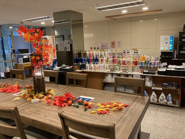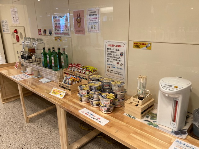 チェックイン後のロビーのカップ麺やドリンク類が全てフリー!!