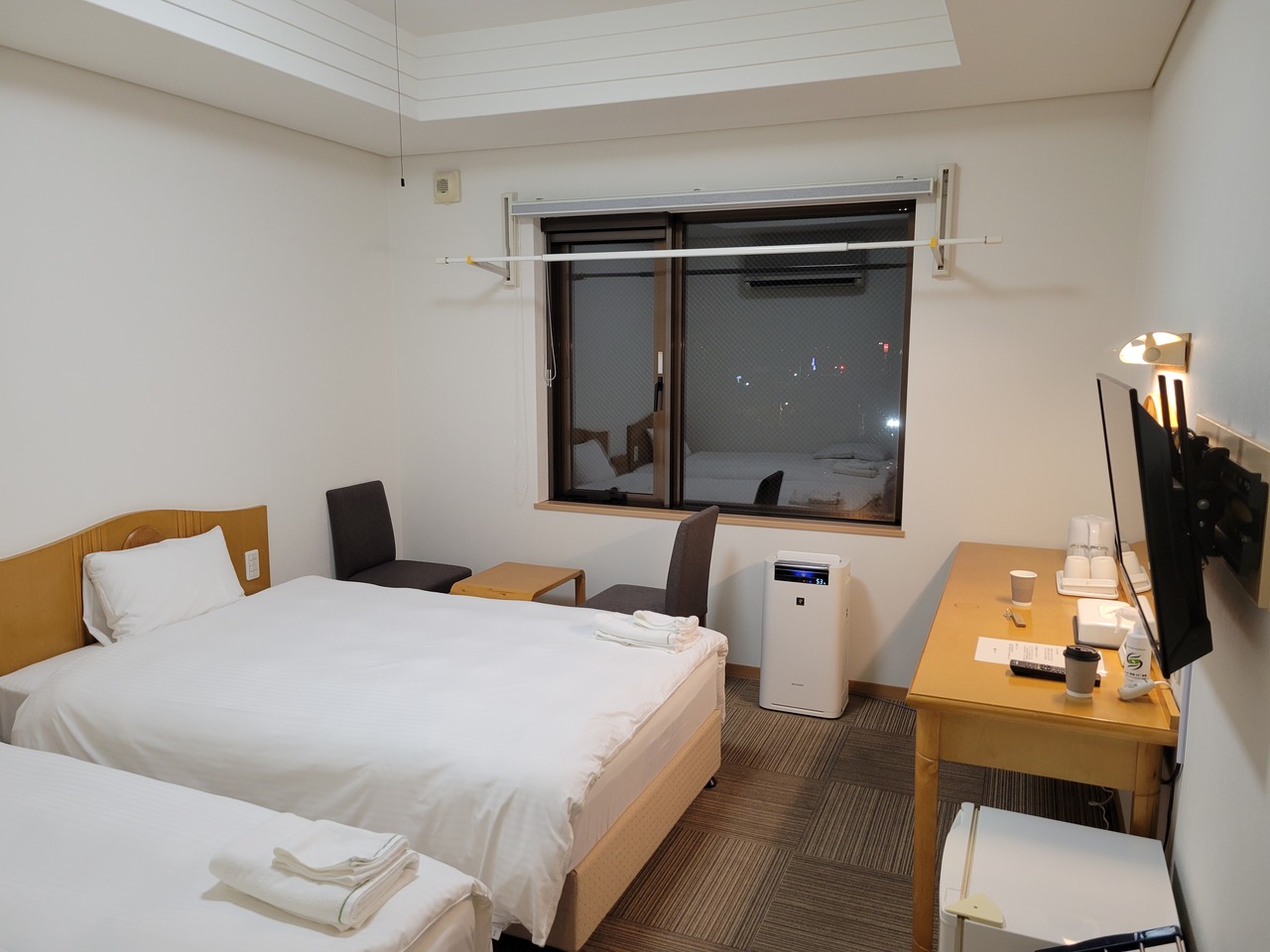 道の駅おとふけで夕食をとってから行きました。車だと帯広の市街地からもアクセスしやすいです。白色を基調にした明るいツインの部屋で、洗面台が広くて身じたくしやすかったです。温泉は露天風呂や温度別にいろんなお風呂があってじっくり浸かって長湯できました。朝食バイキングは野菜ピクルスやいかの塩辛、よつば牛乳、昆布巻きがおいしかったです。