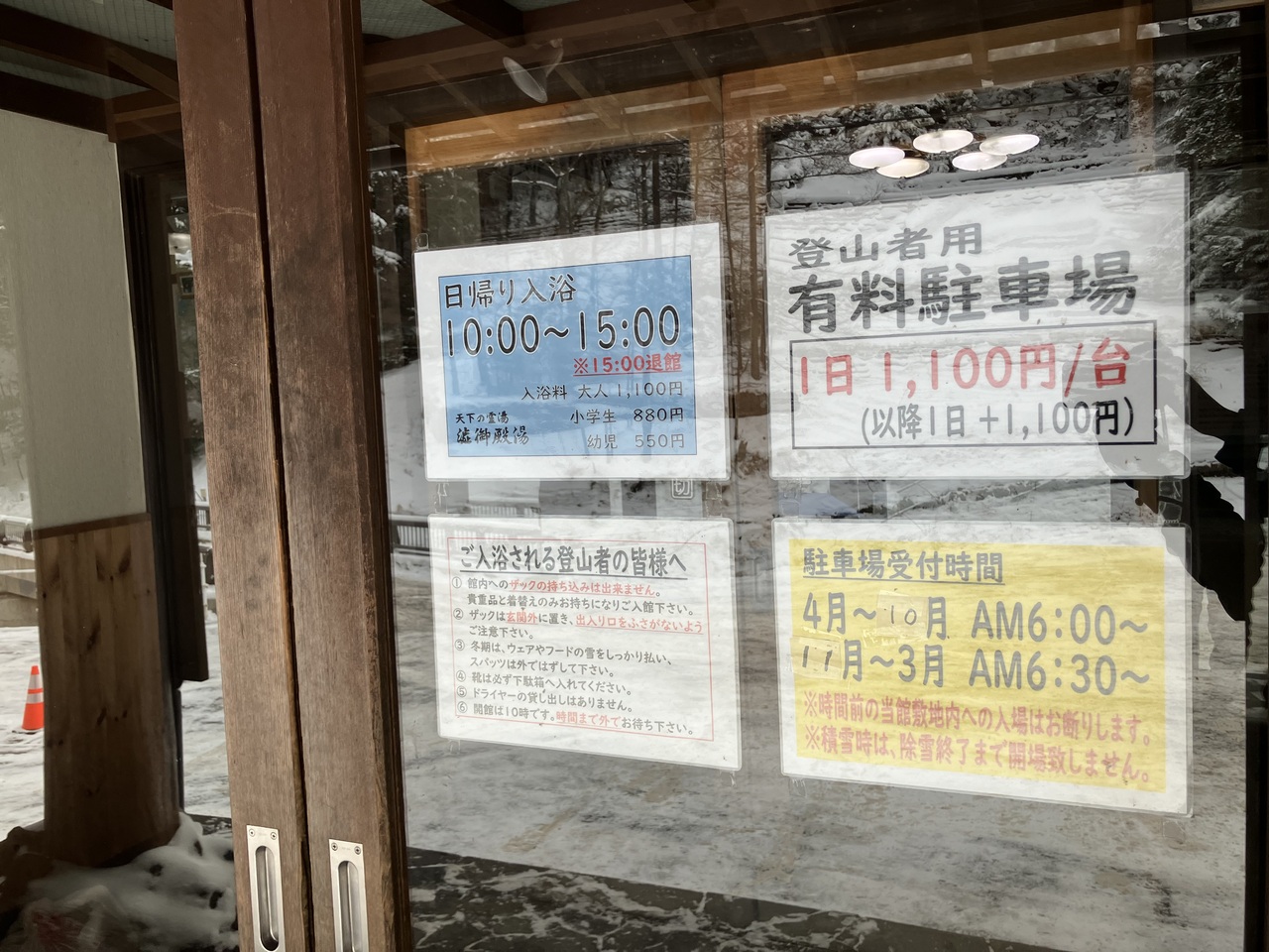 趣があると言えば良いですが、良くも悪くも古くて、かつ広いので暖房が効いておらず、冬はかなり寒いです。立ち寄り温泉はどんどん値上がりしていて1100円になっていました。外来温泉の時間は10時から15時です。食事などはできないので、温泉のみとなりますが、お湯は白濁した硫黄の泉質で、とても温まります。登山の帰りの時間調整にちょうどいいです。