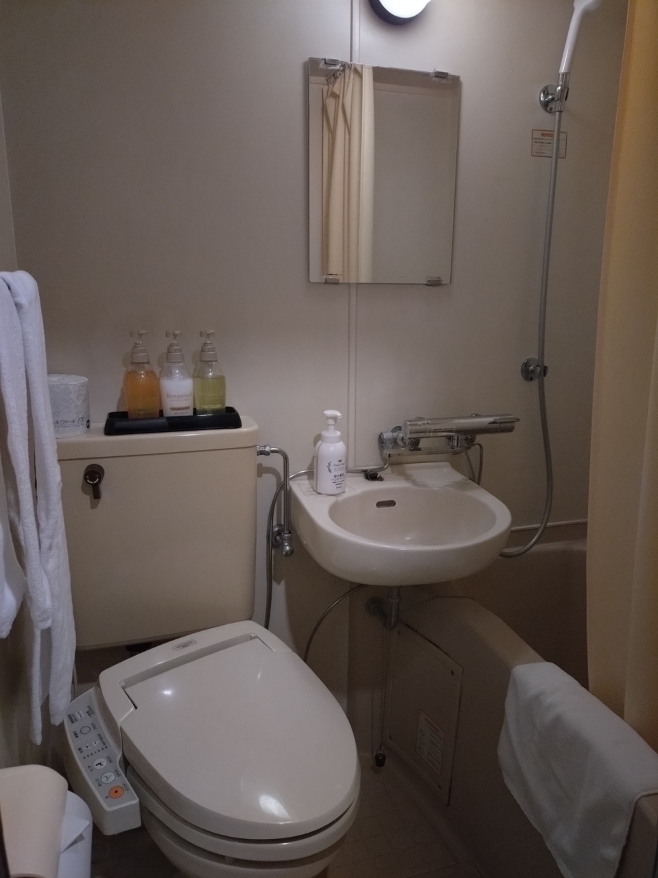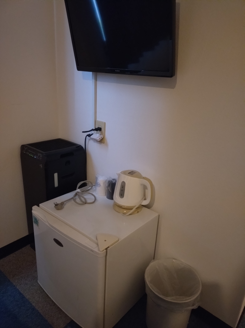 1泊4000円前後だけど、部屋には必要な物はちゃんと揃ってます。パジャマ、シャンプー、ドライヤー、冷蔵庫、湯沸かしポット、テレビ。