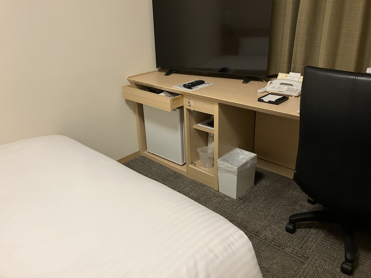部屋はダブルルームでした。広さや設備など一般的なビジネスホテルにあるものがあるという感じですが、デスクスペースが比較的広めです。椅子が一つですが出張でシングルユースなら使い良さそうです。綺麗で快適。