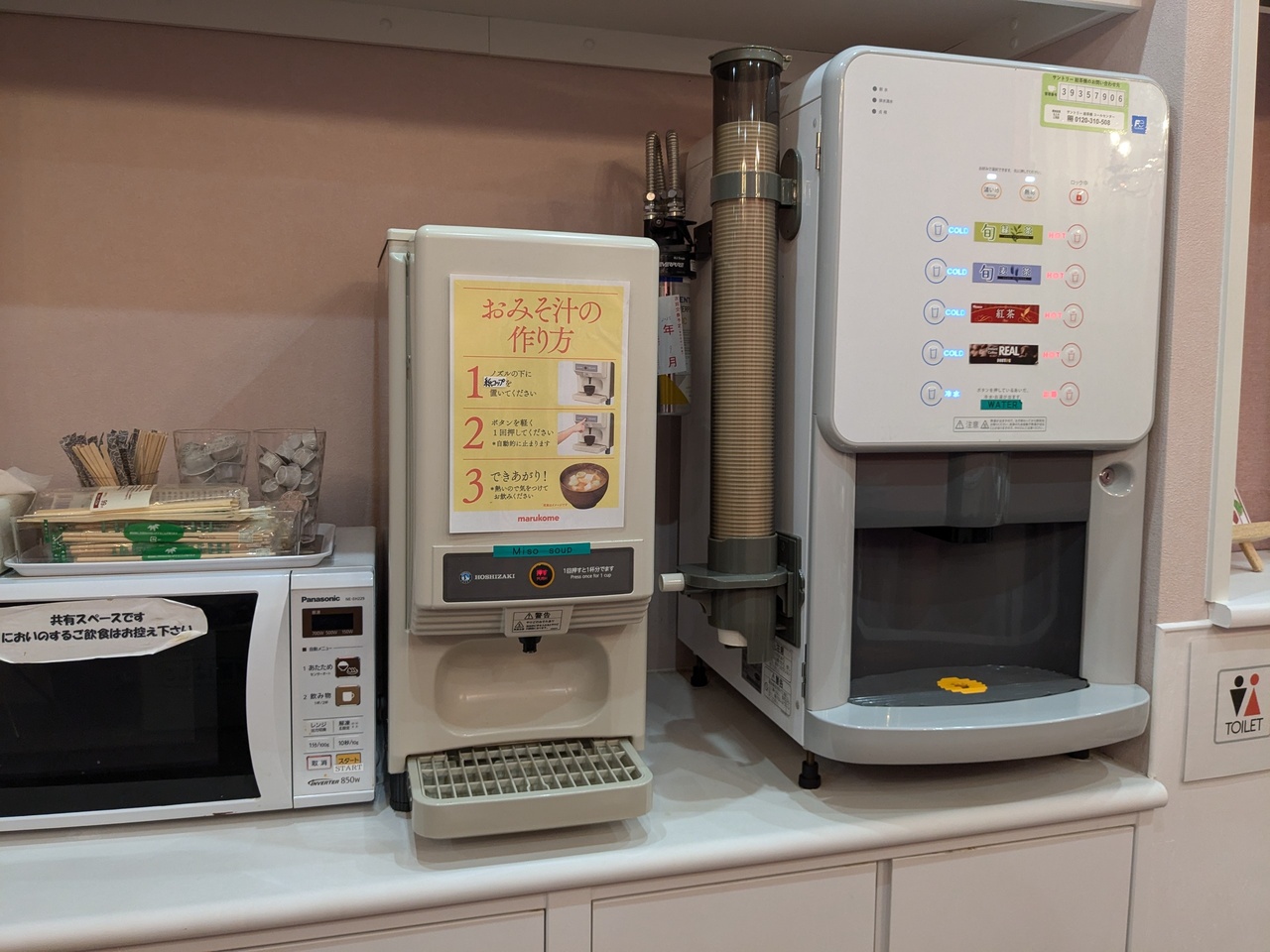 フロント奥の共有スペースでは本棚の本が読めたり、フリードリンクがあったりしたので時間を潰すのにも良さそうです。