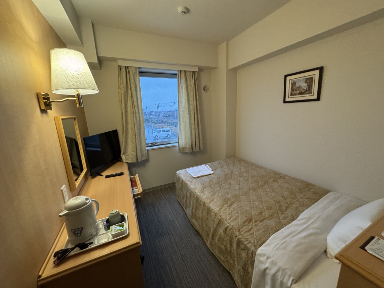 駅から遠い列車の撮影地に近かったので拠点として利用。宿は近年できた雰囲気なので綺麗で、周囲でスポーツの大会などが盛んなのか合宿の学生さんなども多く泊まっていました。部屋は普通のシングルルームで、個別空調で概ね快適。ただ線路脇なので列車の走行音が気になることと、カーテンの遮光性がなさすぎて外のネオンが入りまくりなのはちょっと残念なところでしょう。