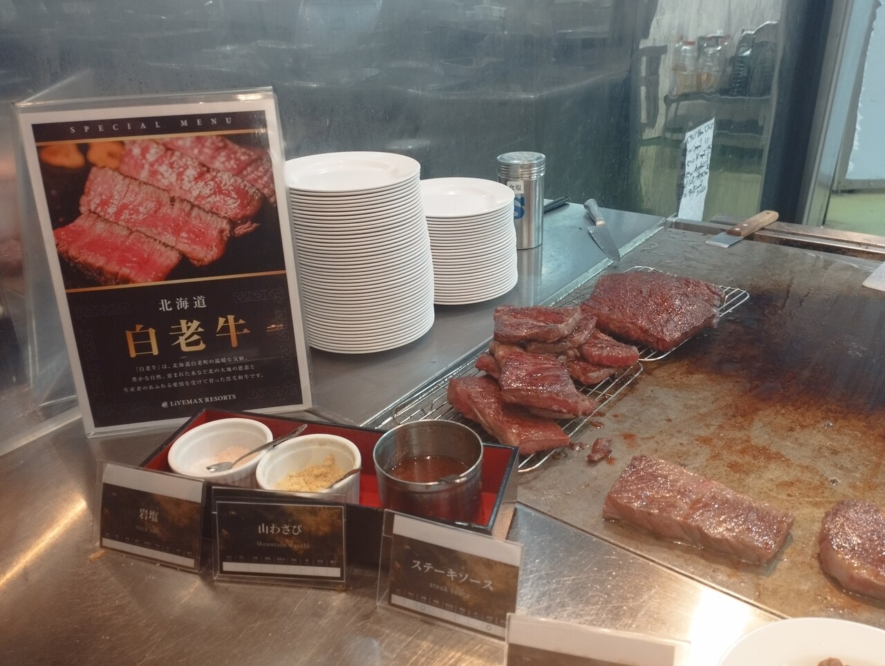 食事は大満足、夕食は白老牛のステーキやいくら(マスいくらではなく本物のいくらです)シャインマスカットが、朝食もマグロやイカのお刺身が食べられます。