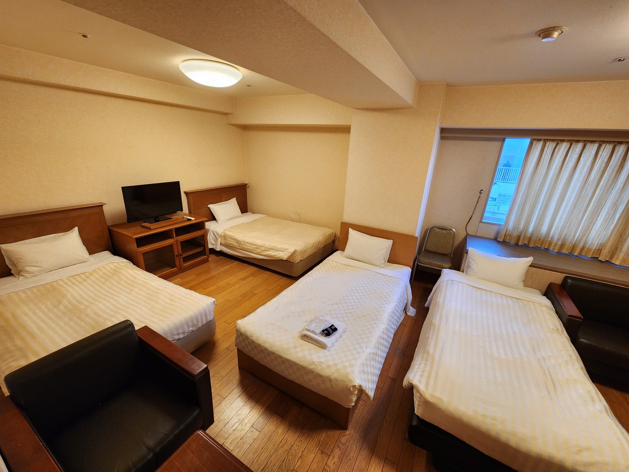熱海駅近くに用事があり、一人なので素泊まりできるこちらのホテルを利用しました。仲見世の下の入り口にあり目の前はファミマです。混んでいてチェックインに30分かかりました。ほとんどが年配の宿泊客なので色々時間が余計にかかります。一人なのに5階の4つベッドがある広い部屋に案内されました。かなり古いけど大きな部屋は嬉しいです。本館と別館に1つずつ温泉大浴場があり、両方利用できます。熱海の熱い湯はポカポカ温まりまって最高です。素泊まりで温泉大浴場つきで6800円なら納得です。2月5日