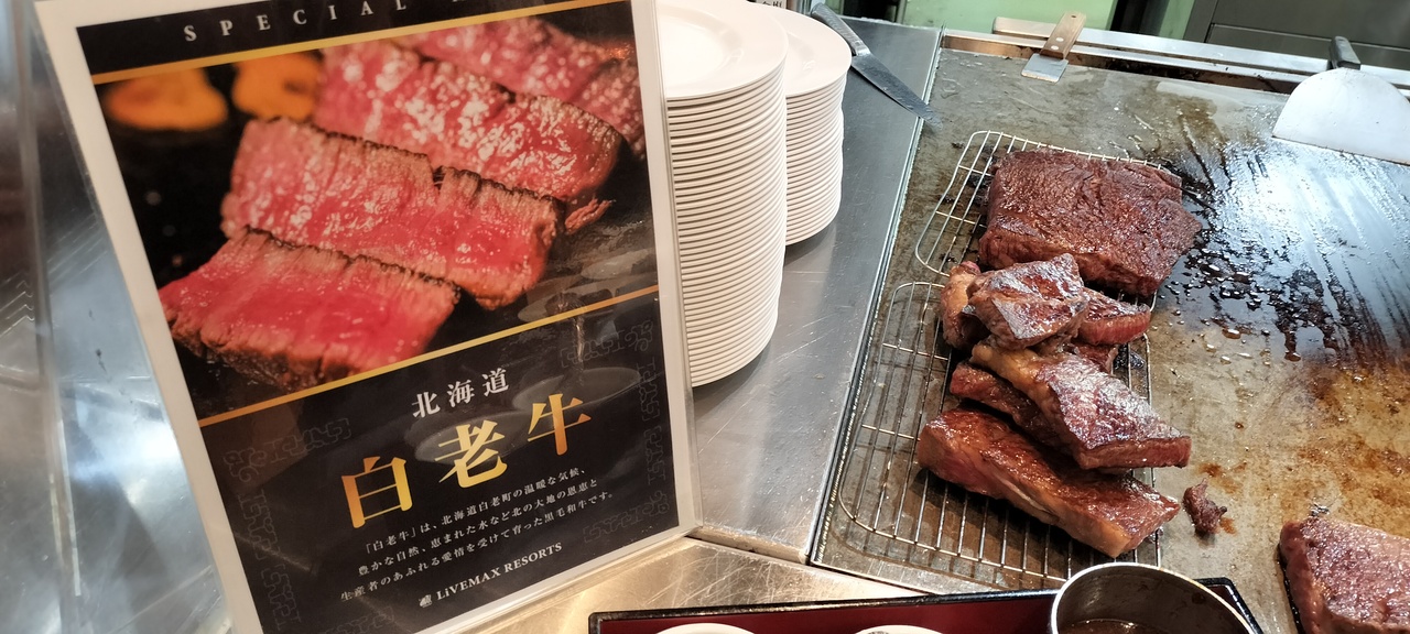 夕食のウリは白老牛のようで、ステーキ、すき焼きのほかに、白老牛とネギの赤味噌田楽焼き、白老牛のスパイス煮込みなど白老牛を使った料理が多かったです。個人的には赤味噌田楽焼きが絶品でした。ステーキは、白老牛であることは事実でしょうが、ビュッフェで提供するものですので、町内のウエムラさんなどでいただくステーキとは当然違います。いただいた感じ、部位はモモ肉だと思われますが、その中でもランプ的な柔らかい部分、内もも的な硬い部分が混在していましたので、ステーキの皿を取る時は目利きが試されます。一方ですき焼き用の白老牛はバラ肉と思われましたが、脂身たっぷり、良く言えば霜降り肉で、卓上のコンロで焼くと鍋の底が脂の海になるほどでした。ステーキと比較して柔らかいお肉でしたので、霜降り好きの人はこちらの方が口に合うかもしれません。また、刺身はイクラ、マグロ、炙りサーモン、ハマチ、桜鯛、締めサンマと種類豊富でした。イクラが鱒イクラではなく鮭イクラだった(と思われる)のは宿泊料金を考えると衝撃的でした。まぁビュッフェのイクラなので濃い味付けにしてあり、大量に食べられる感じではなかったですが。あとは、フルーツ盛り合わせにイチゴがあったのも良かったのですが、旬のシーズンにしては甘さが足りず、こちらはもう一歩でした。
