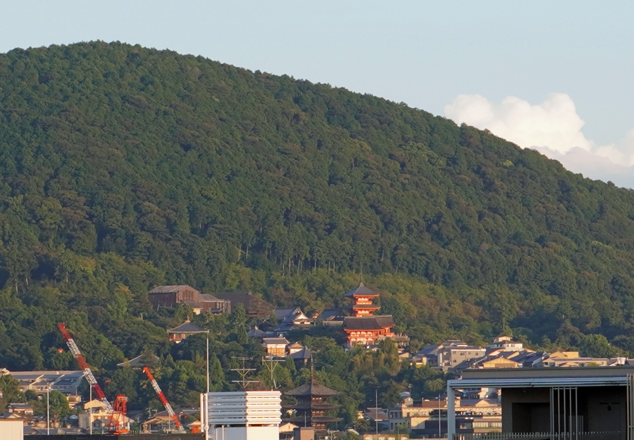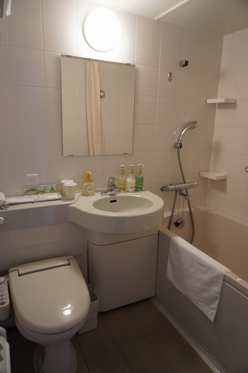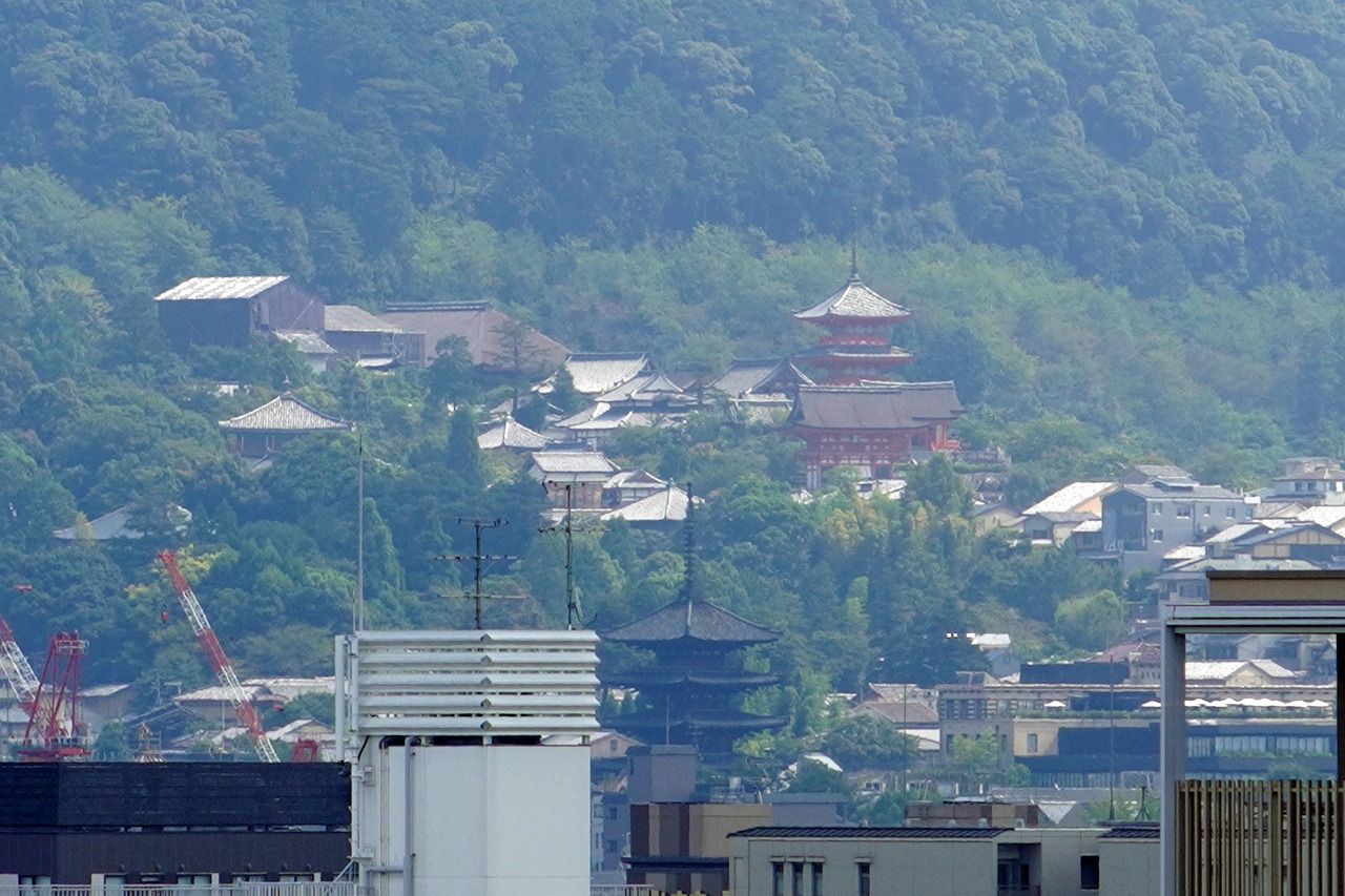 トラピックス社のホテルと航空券がセットになったフリーツアーで利用しました。新幹線ではなく羽田空港と神戸空港間のスカイマークの航空券がセットになった格安ツアーです。今回は3泊4日で32,300円という料金設定でした。京都駅からはタクシーで1,600円でしたが、地下鉄で烏丸御池駅で下車しても徒歩10分くらいの距離なので移動には便利です。また、三条通界隈も至近距離なので、朝食の付いていないプランでもイノダコーヒ本店まで歩いて10分くらいで行けます。1975年の昭和50年創業で、出来たときは御池通の並木道にパリのホテルのようなキャノピーを備えていて話題になりました。さすがに50年は経過しているので客室階は古びた感じもありますが、きれいに保たれていると思います。お昼ごろに着いてしまったので荷物だけ預けようと思いましたが、清掃が終わっているのを確認して部屋に通していただけて助かりました。部屋は東側の9階だったので、窓からは比叡山から南まで東山の山並みが見渡せました。部屋も経年を感じますが、バスルームは新しく取り換えられていました。部屋もバスルームも広めなのでストレスなく滞在できました。ただ、全体的に廊下も部屋の中も暗い印象を受けました。