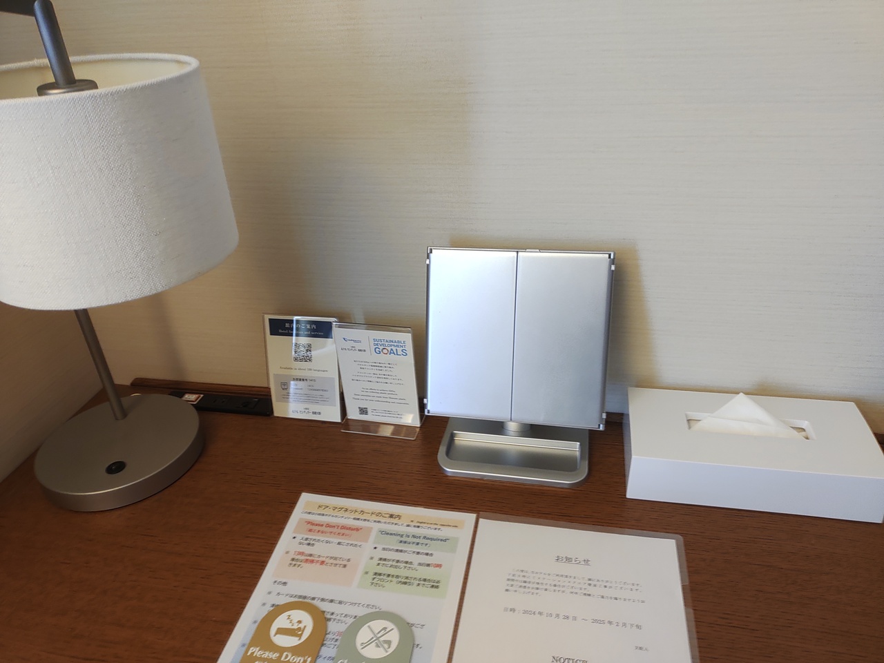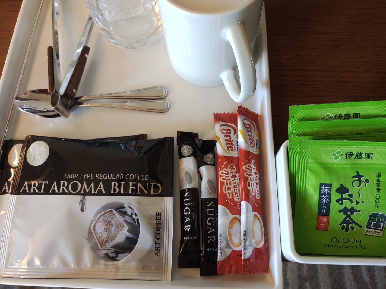 チェックイン時刻の一時間以上前の到着でしたが、すぐにお部屋を利用することができました。リクエスト通り、一番上の14階の静かなお部屋で、コーヒー等飲みながら、くつろいでいます。お部屋に、ドリップパックのコーヒー、お茶も4袋もありました。七階のフロント前に、アメニティーバーがあり、いろいろな種類の紅茶や、入浴剤、レディースセットなどあります。17時半から利用できるアルコールチケットもいただきました。