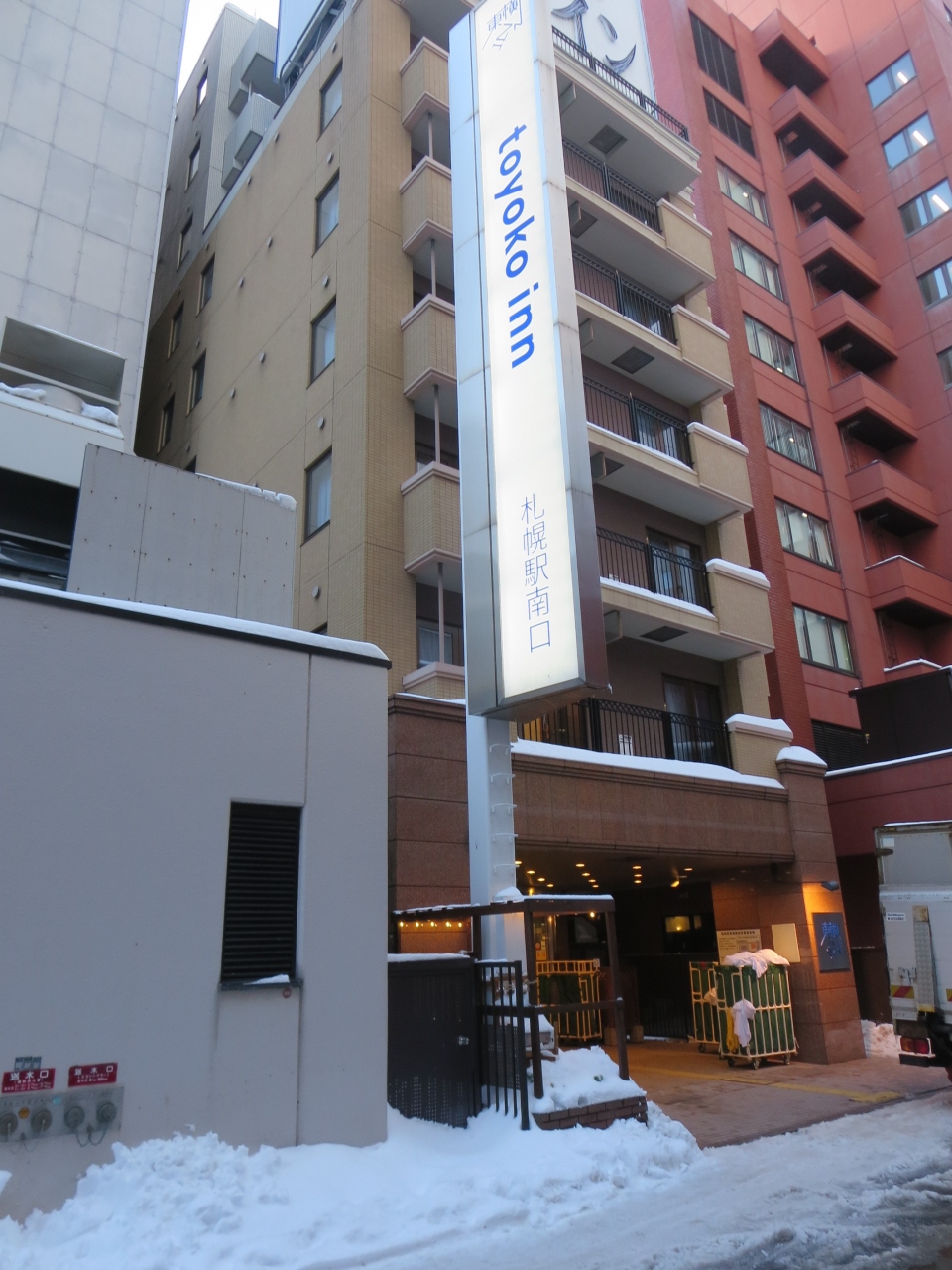 札幌ゆき祭りをまだ見たことのない家族のために札幌を中心とした地域を観光しました。初日に新千歳空港に着いた後は、やや遅めの昼食後にチェックインしました。この時期は中国の春節とゆき祭りが重なり、インバウンド客が多く宿泊費がかなり高く感じますが、このホテルの宿泊は比較的に良心的です。札幌駅東口から雪のないときは5分少しで歩いて行けます。しかしこの時期は雪が残っているので歩きにくく、また裏通りはしっかり除雪されていないのでもう少し時間がかかります。ホテルの前面通りは裏通りのような感じで除雪されていません。昼間は水が浮くと靴を濡らしそうです。フロントで自動チェックインし、部屋に入ります。早速部屋の隅々まで確認すると、ベッドがクィーンに近い広さです。さらにベッドの横は広々していて、小さな丸テーブルを置いても余裕があります。東横インでは初めてこの広さに出会いました。風呂は洗面、トイレの一体型です。浴槽はやや広めで深さもあるのでゆったり入浴できると思います。朝食は東横インでよく見かける朝食です。バイキング形式で朝食としては十分なものです。