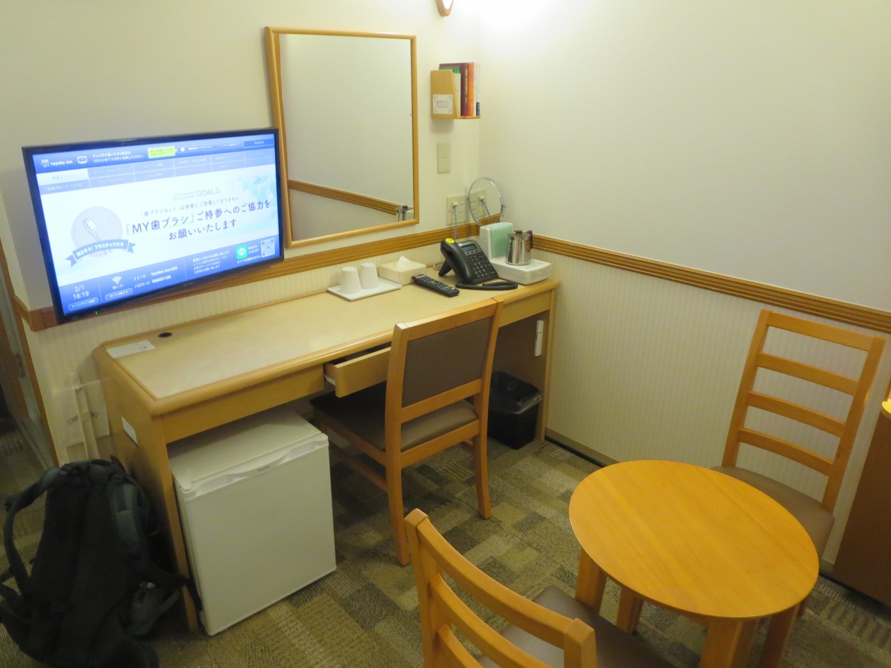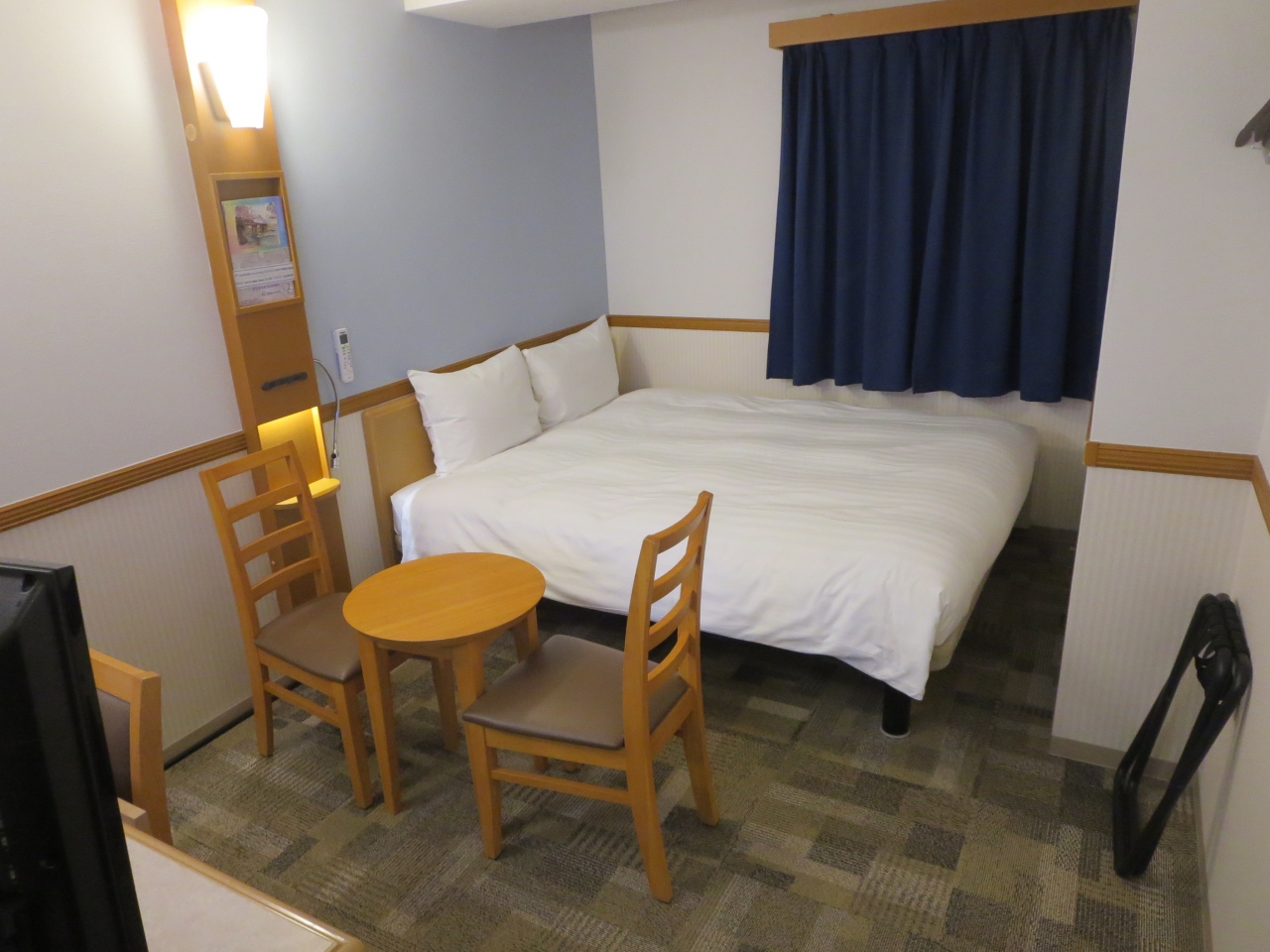 - 普通の東横インはベッドサイドがやや窮屈な感じがしますが、このホテルはベッド横に二人掛け丸テーブルが置けるくらいスペースがあります。