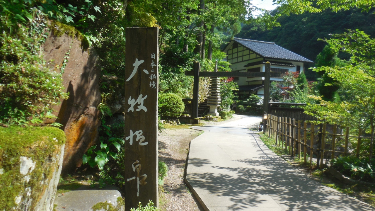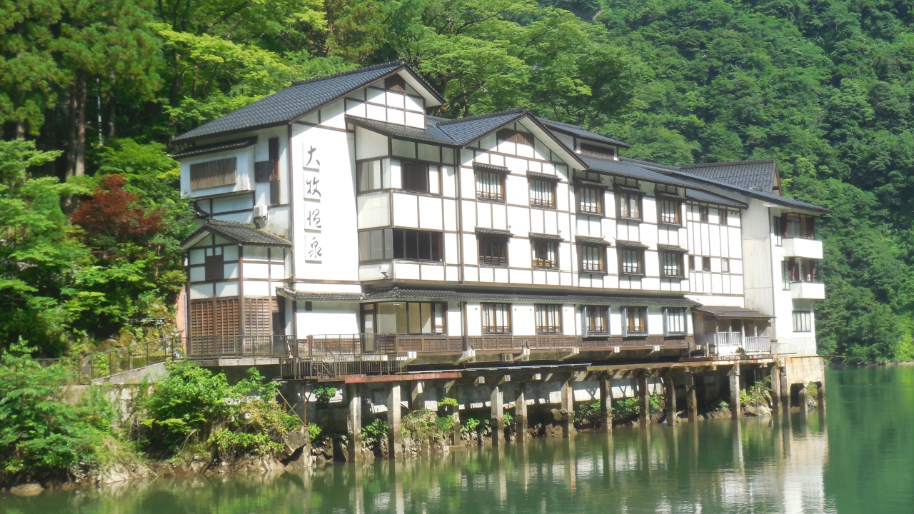 船でしか行けない特別な旅館。いつか行きたいと思っていました。高岡から路線バスで庄川乗り場まで行き、庄川遊覧船に乗ります。この遊覧船からの眺めも山奥に入っていく感覚があり、とても情緒があります。私が行ったのは緑深い夏でしたが、きっと紅葉や雪景色もすばらしいことでしょう。船は、大牧温泉旅館の全景を見せてくれます。