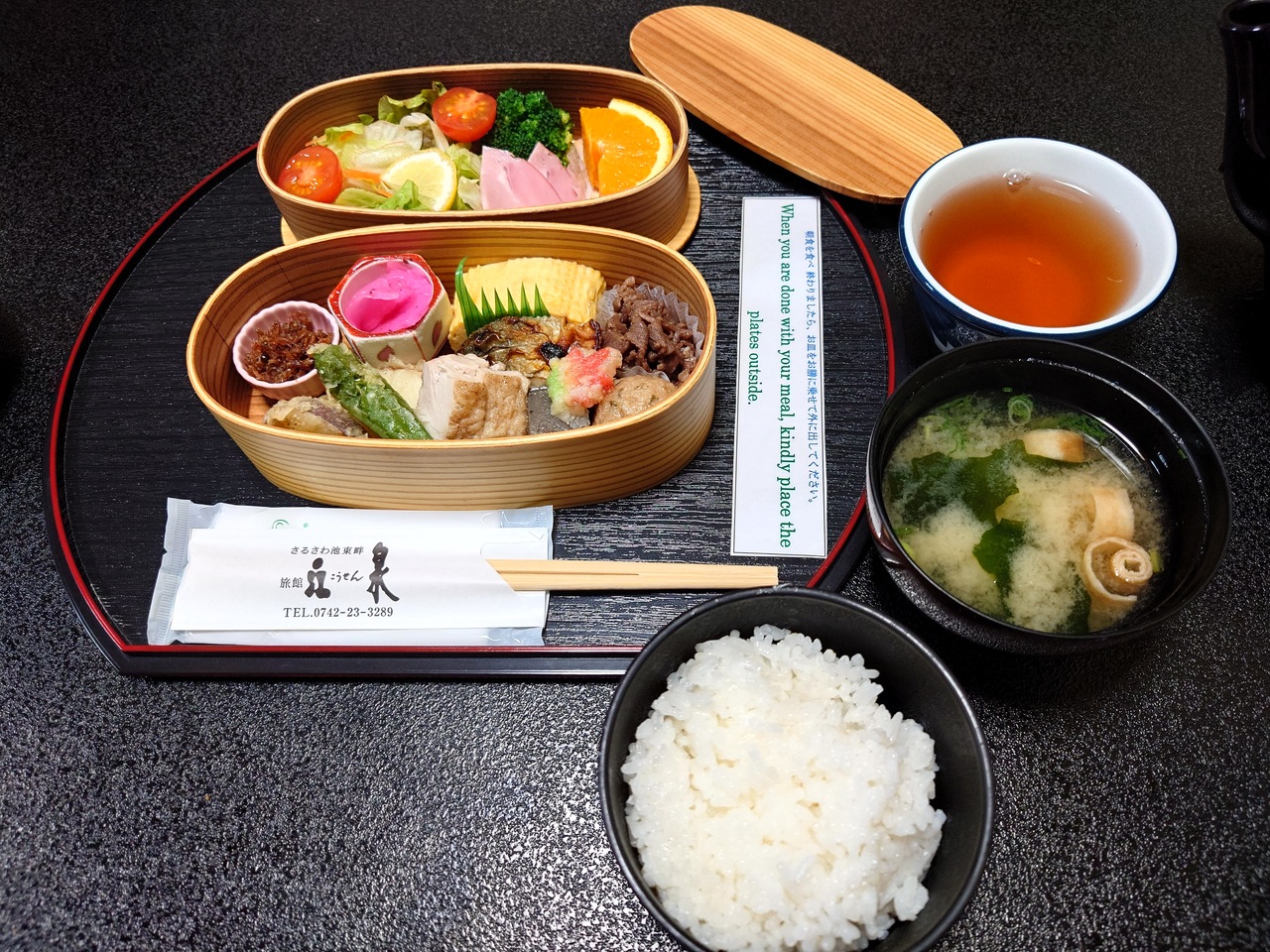 朝食付きにしたんですが、部屋食でお弁当です。二段のおかずとご飯、味噌汁、お茶付きで…指定した時間に届けてくれます。