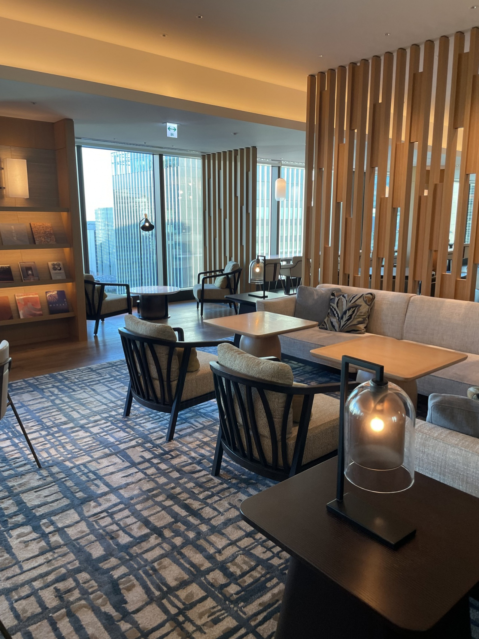 ラウンジは、22Fの高層階で、ガラス張りなので眺めもよく開放感あり、新しいので綺麗で快適です