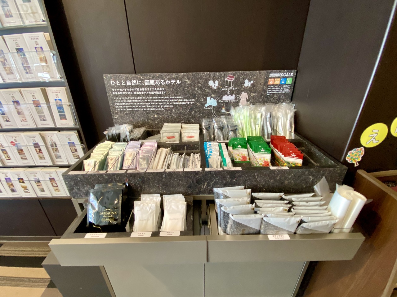 部屋に有るが、その他の歯ブラシ、体洗いタオルなどアメニティの多くは