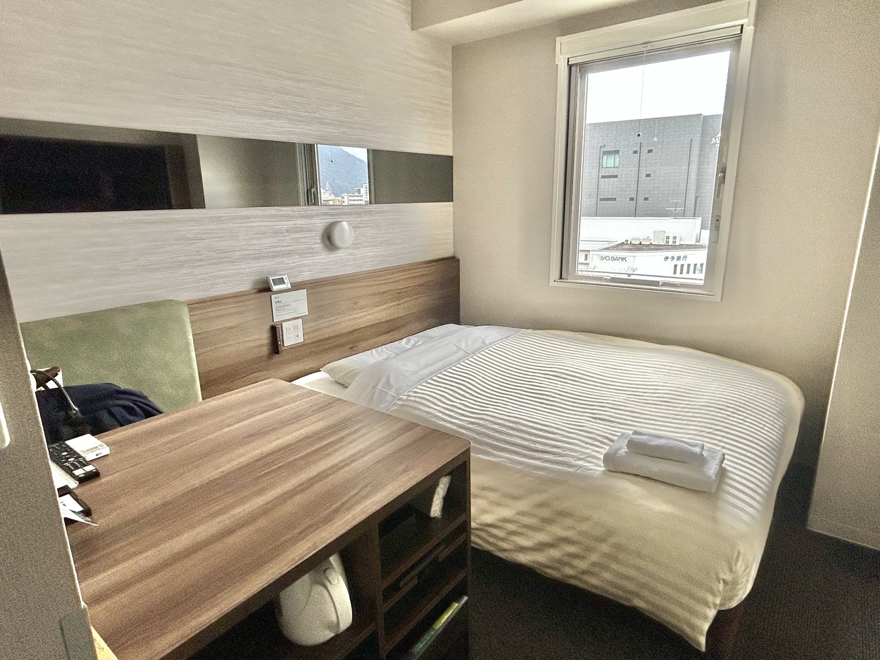 大分駅から徒歩で2・3分ほどの場所にあるビジネスホテルです。客室は若干狭さが感じられますが、セミダブルのベットは快適に寝ることが出来ました。大きくはないですが、... もっと見る