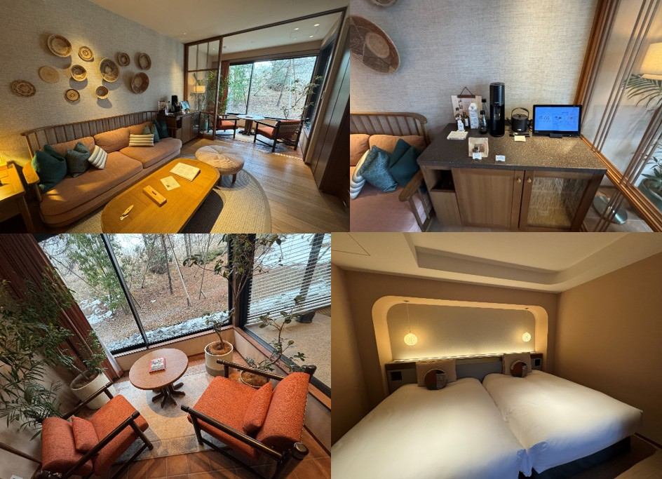宿に到着すると超高級宿らしく、丁寧な対応を受けながらチェックイン。宿泊した部屋は1階のコンフォートスイートルームで、ふふ軽井沢では下位の部屋に当たります。