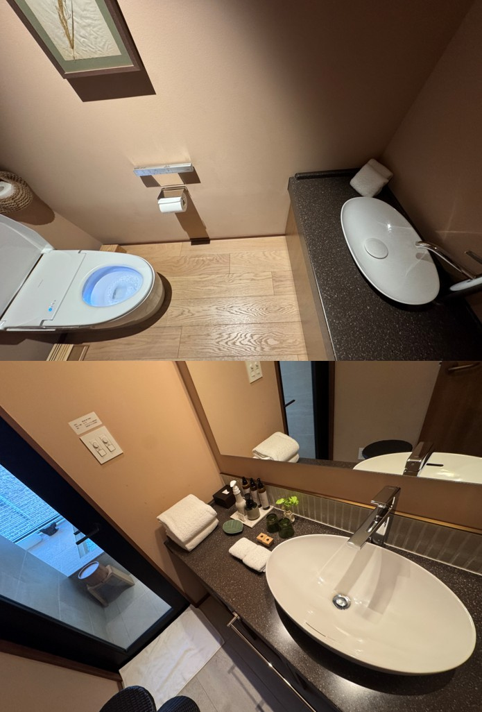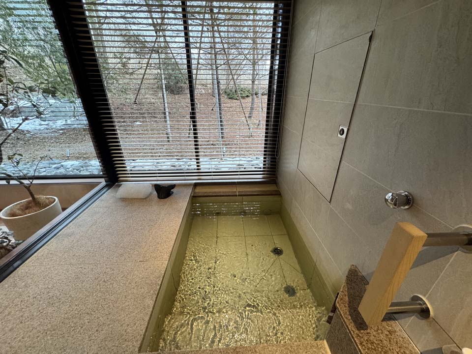 水回りはリビングルームの右手にあり、綺麗なトイレ洗面に蓼科からの運び湯を使用した部屋温泉があります。温泉は運び湯ということもあり薄めでそれなりなのですが、岩盤浴併設&開放的な雰囲気は◎。又部屋にあった小型のテレビが防水仕様で風呂に持ち込み可能で、岩盤浴しながらテレビやネット動画などを楽しめたのも良かったです。