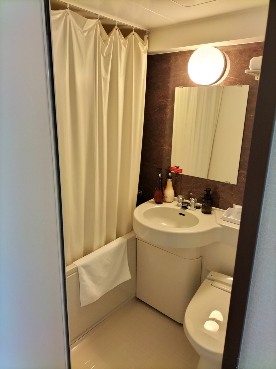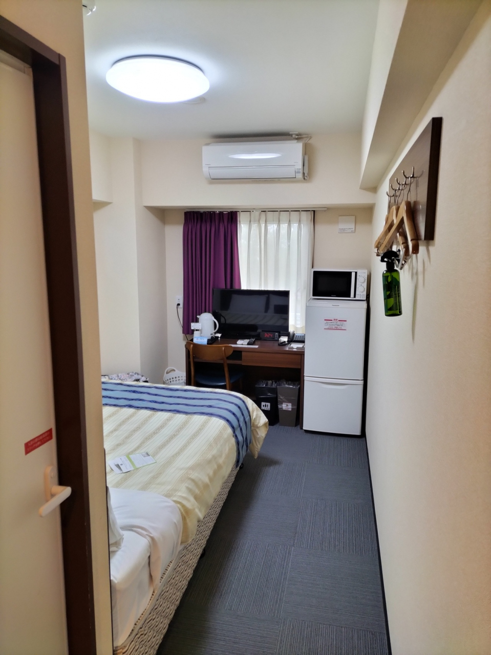 名護の市街地にあるカジュアルな滞在型ホテルで、徒歩圏内にコンビニやスーパーもあります。シングルルームにも洗濯機があり、電子レンジも置かれています。部屋自体はシンプルでバスルームも普通の広さですが、最上階に大浴場があり結構良かったです。