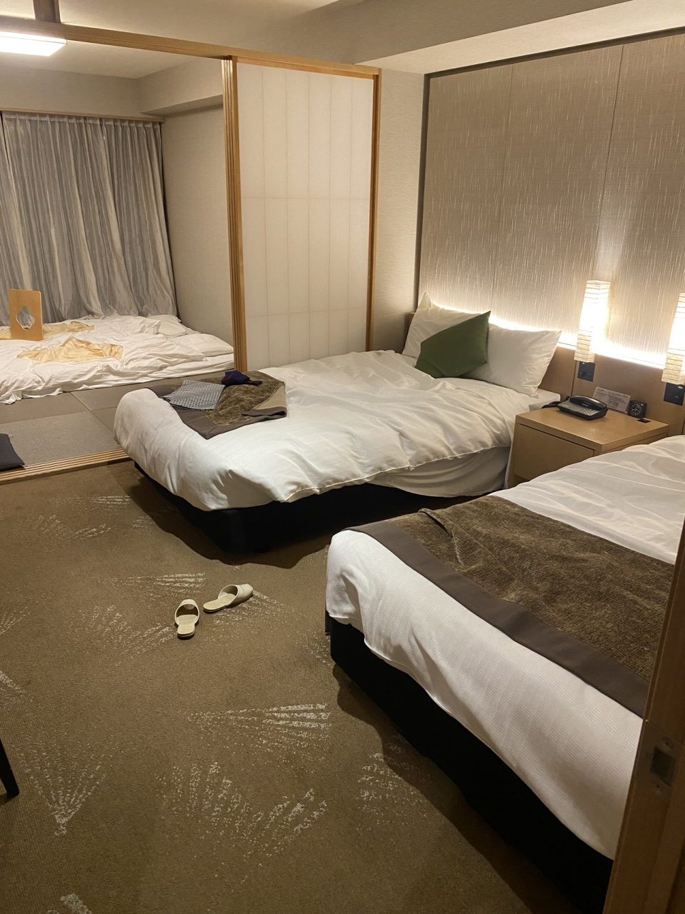 1年ぶりの利用でしたが、レストランのメニューも改善されており、+料金でメインを選ぶようになっていました。今回の部屋は洗面所が2カ所あったり、マグカップの横にシンクがあったりと子連れに優しいお部屋でした。ベッド二台とお布団もありますので、いびきのうるさい主人と、こどもと離れて寝ることができます。JR京都駅から無料のシャトルバスも出ていますが、予約制です。